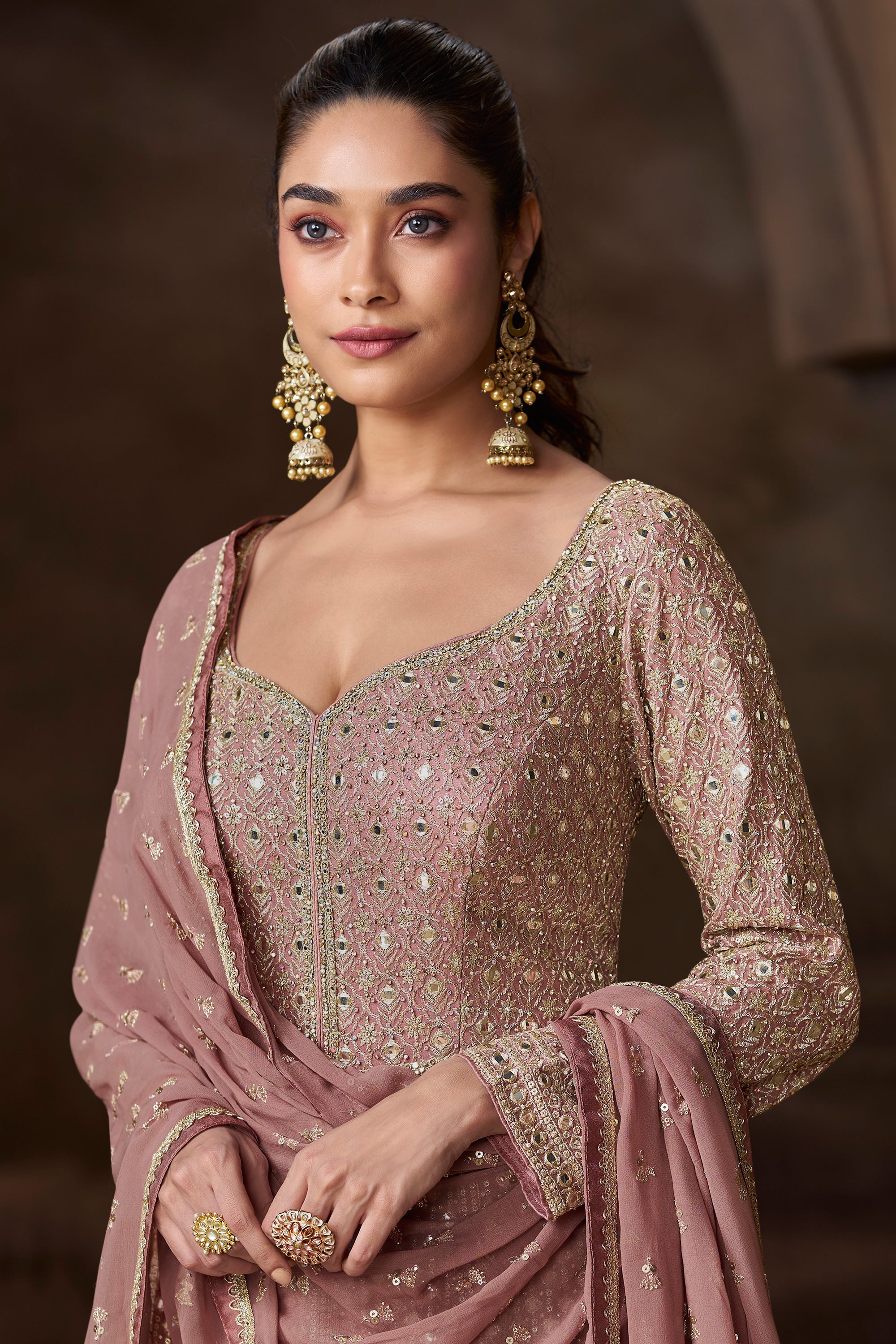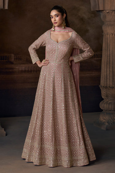 Chinon Silk Peach Embroidered Readymade Long Anarkali Style Gown With Dupatta