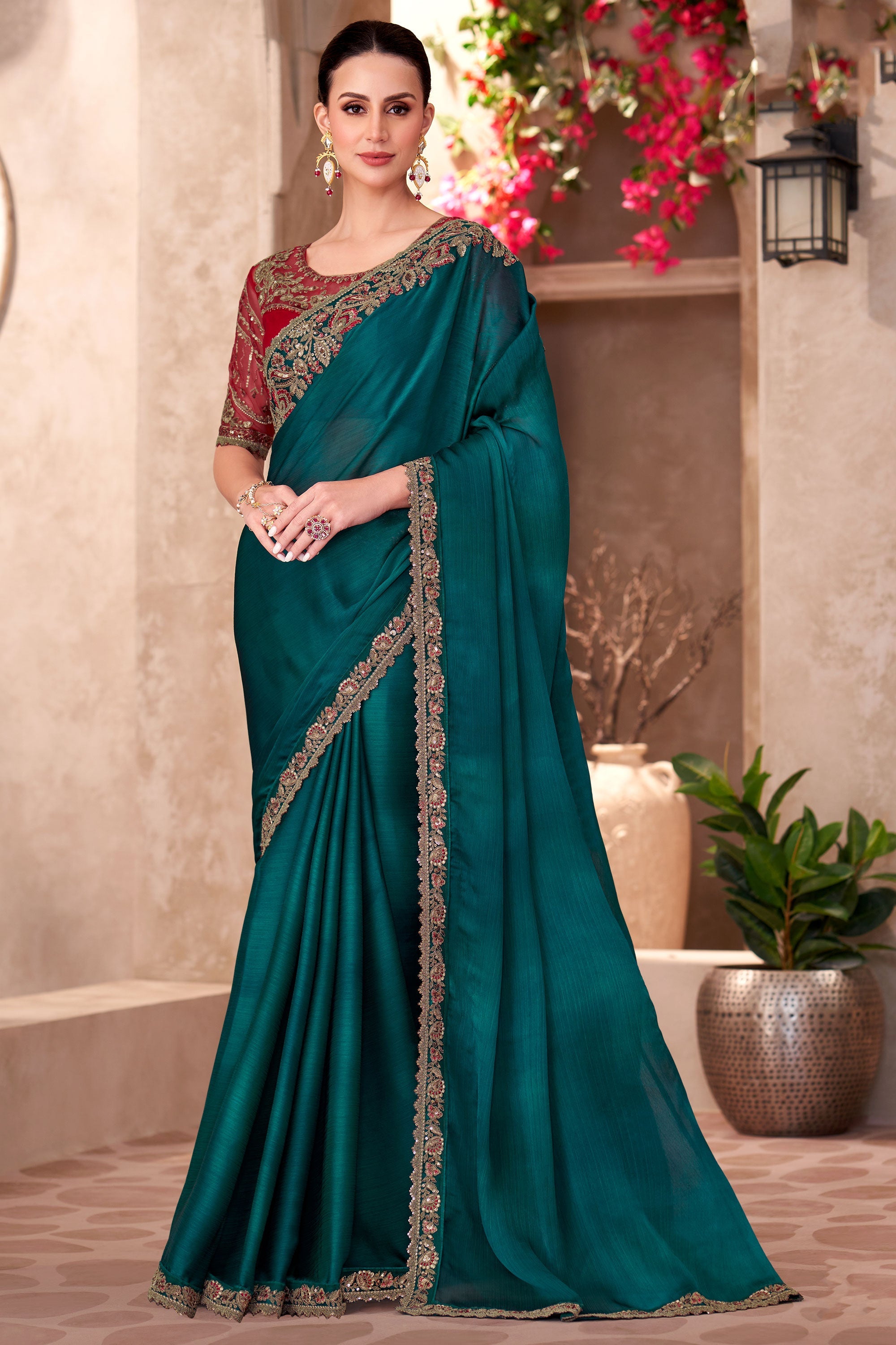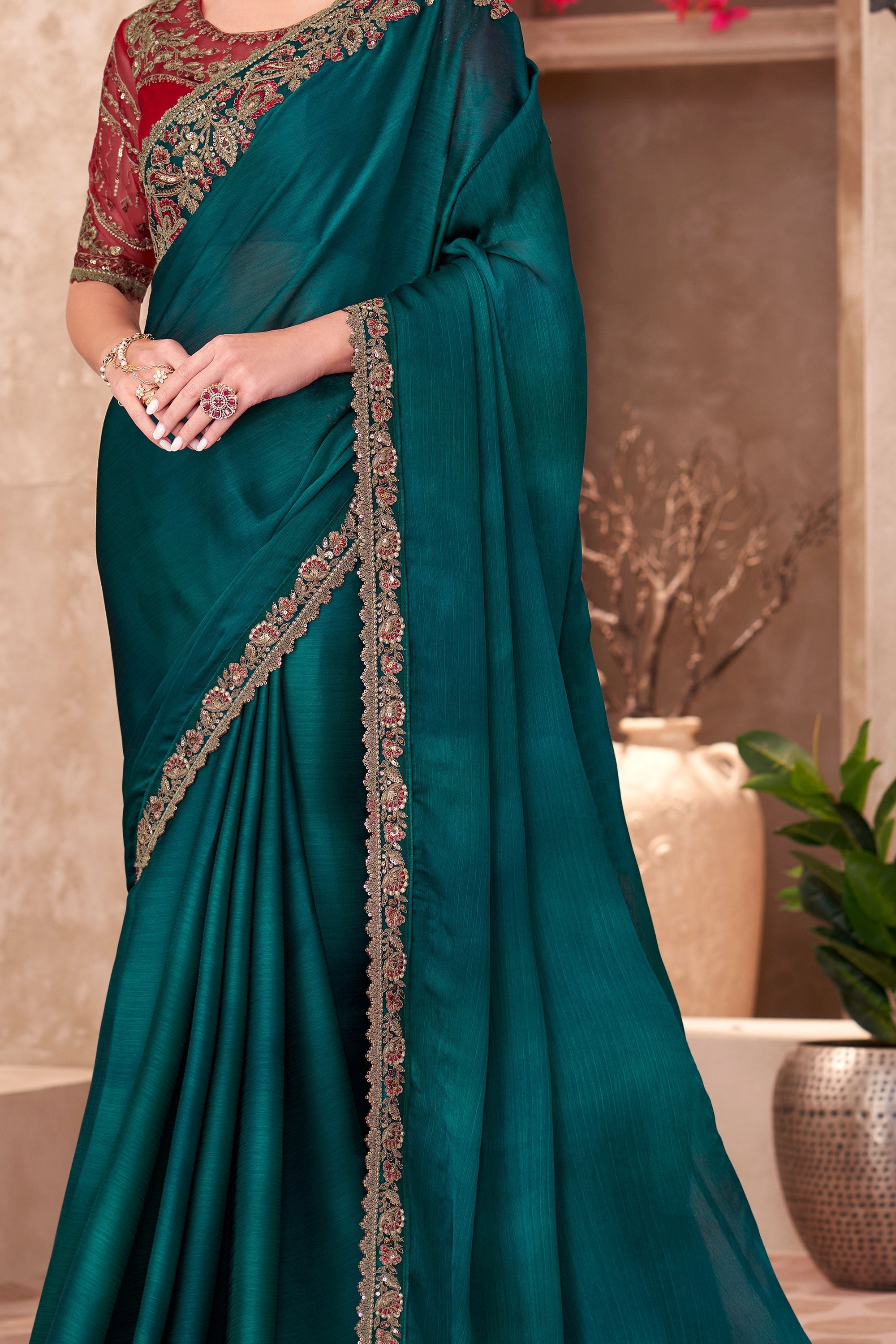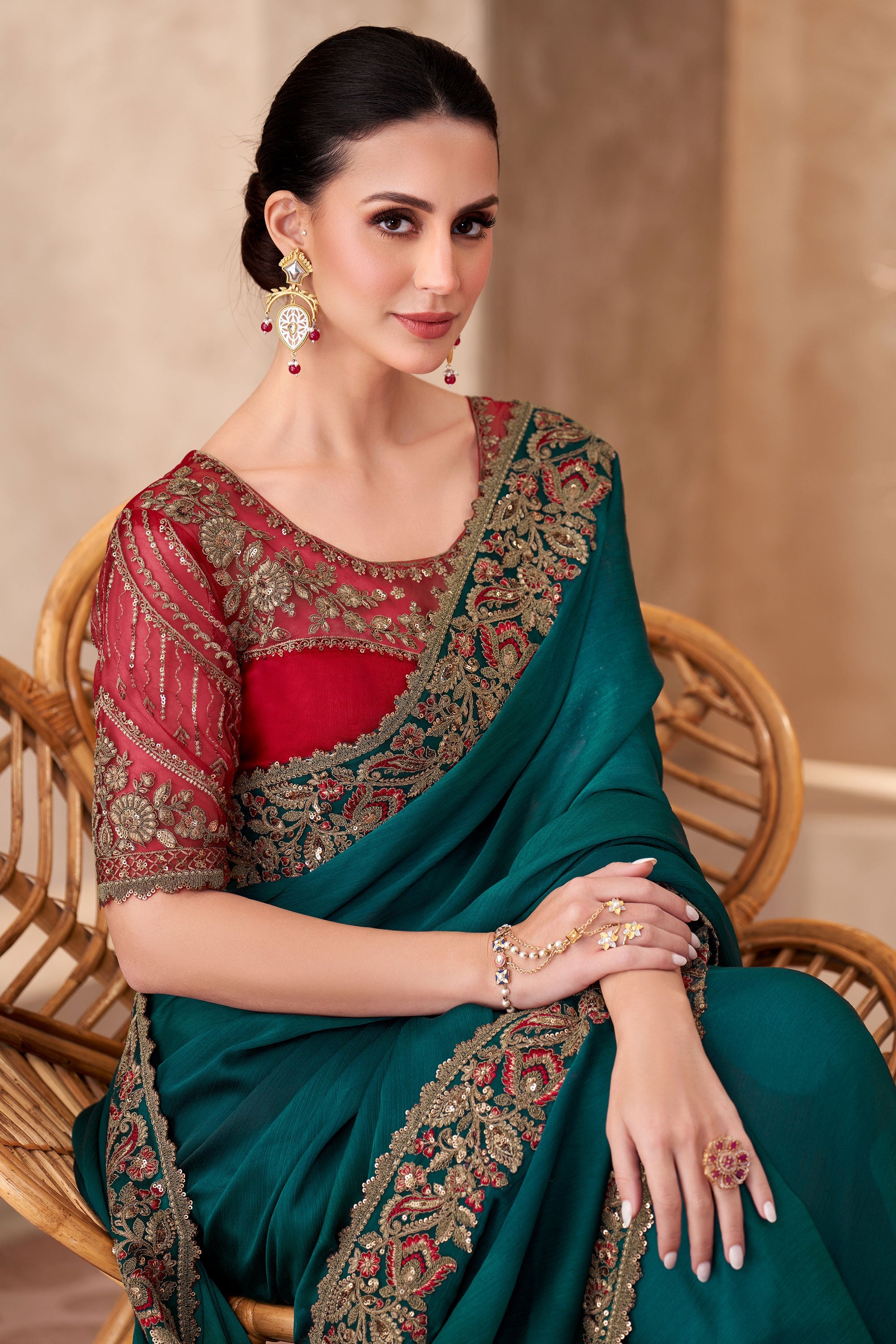 Classic Border Work On Dark Green Color Saree In Chiffon Fabric