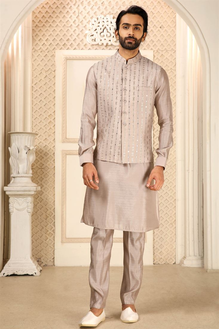 Classic Chikoo Color Kurta Pyjama Jacket Set In Art Silk Fabric