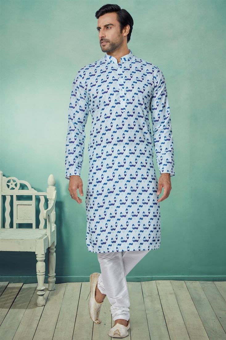 Cotton Fabric Function Wear Readymade Light Blue Color Printed Kurta Pyjama For Men