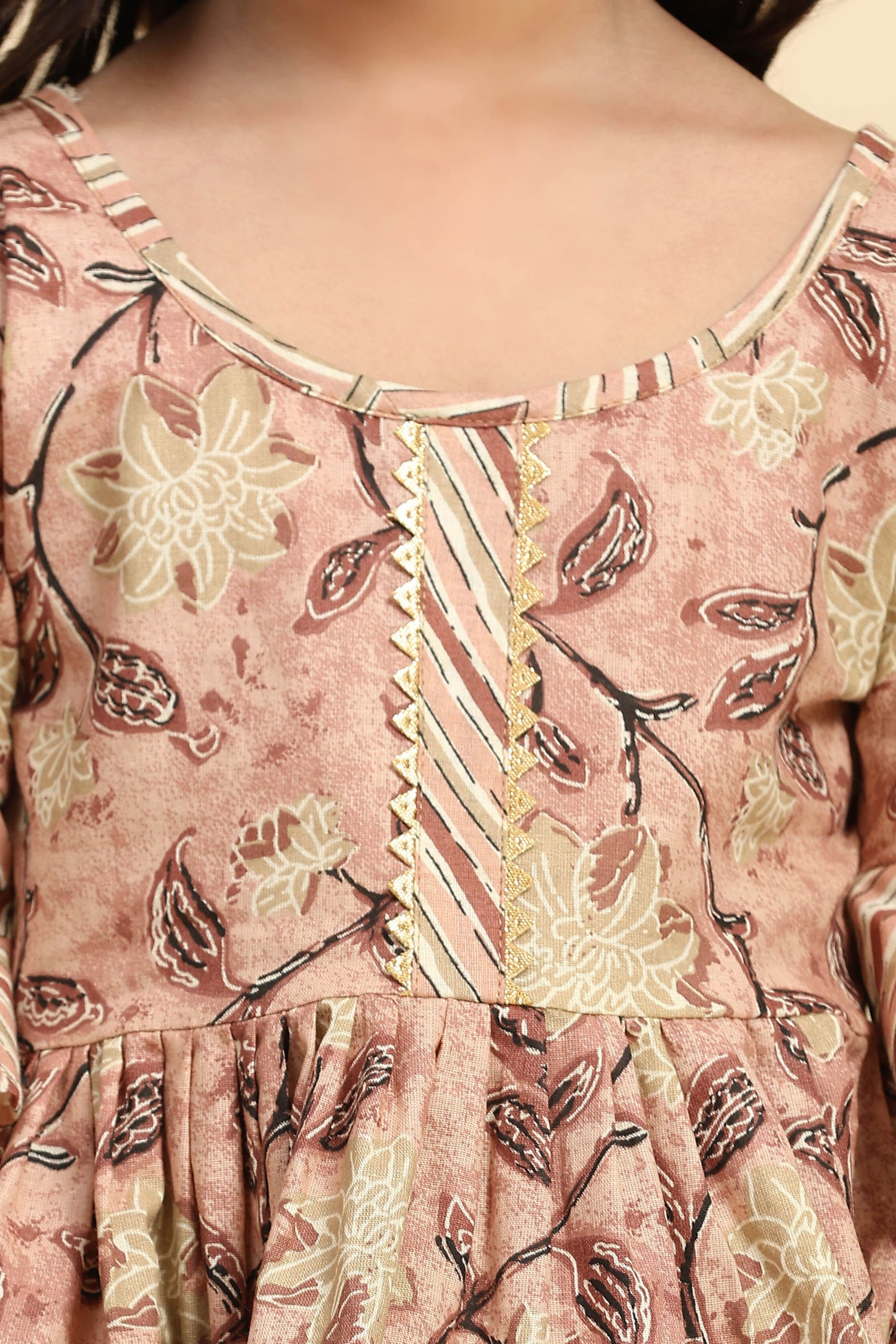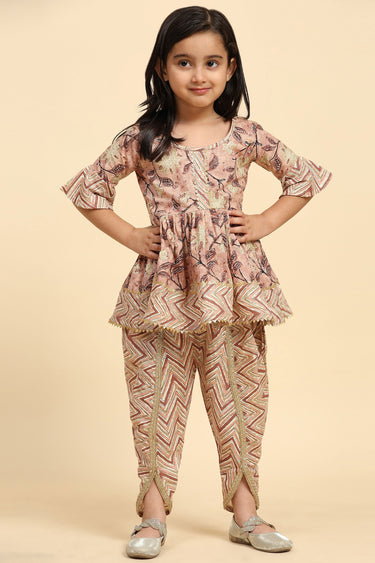 Cotton Fabric Printed Light Brown Color Readymade Kids Kurti With Dhoti Style Bottom