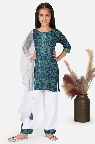 Cotton Fabric Printed Teal Color Readymade Kids Salwar Suit