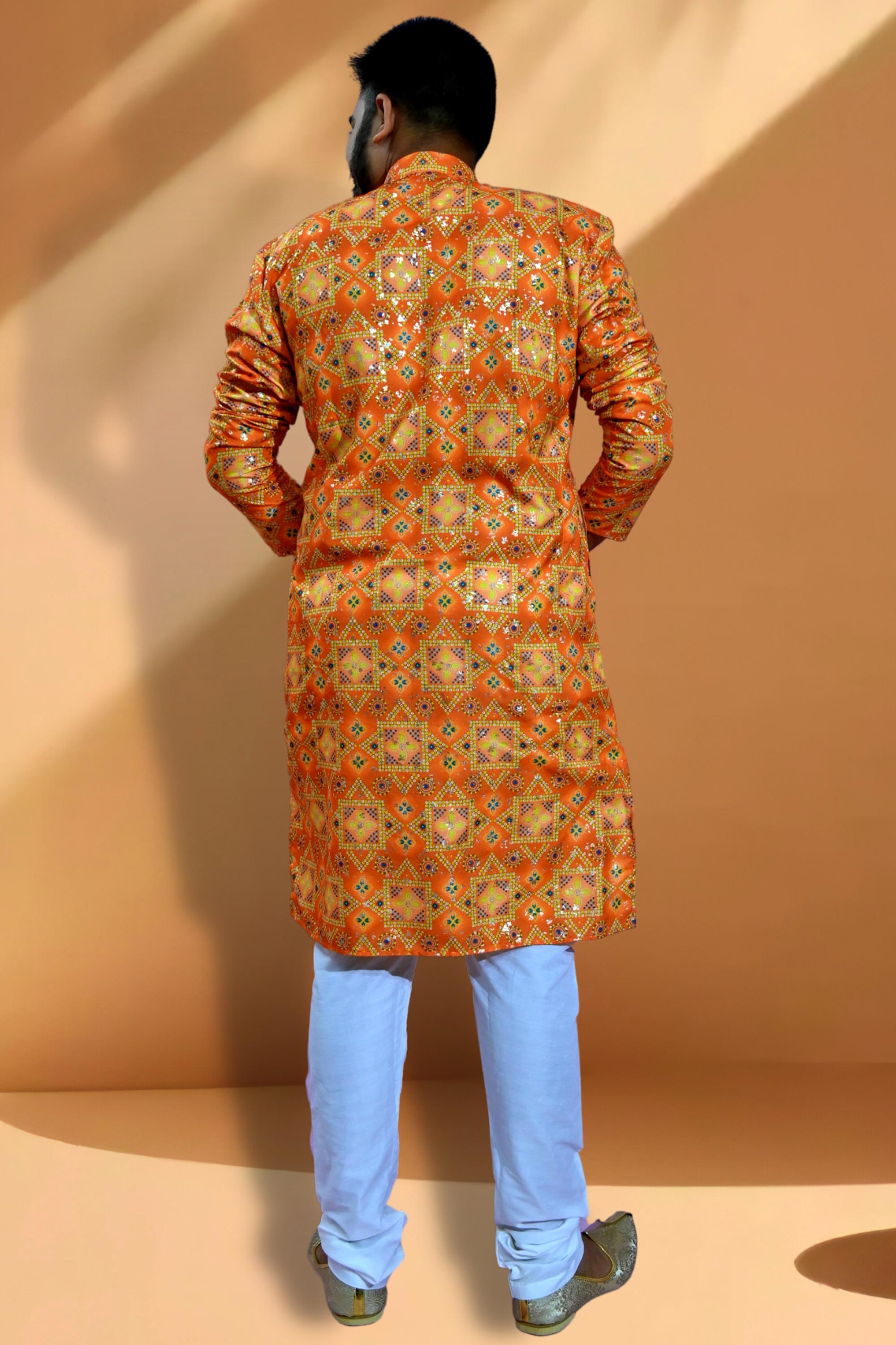 Cotton Fabric Readymade Orange Color Kurta Pyjama For Men
