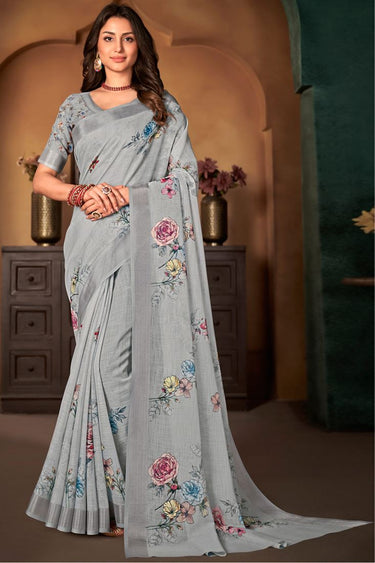 Cotton Linen Fabric Casual Wear Imposing Digital Printed Saree In Grey Color
