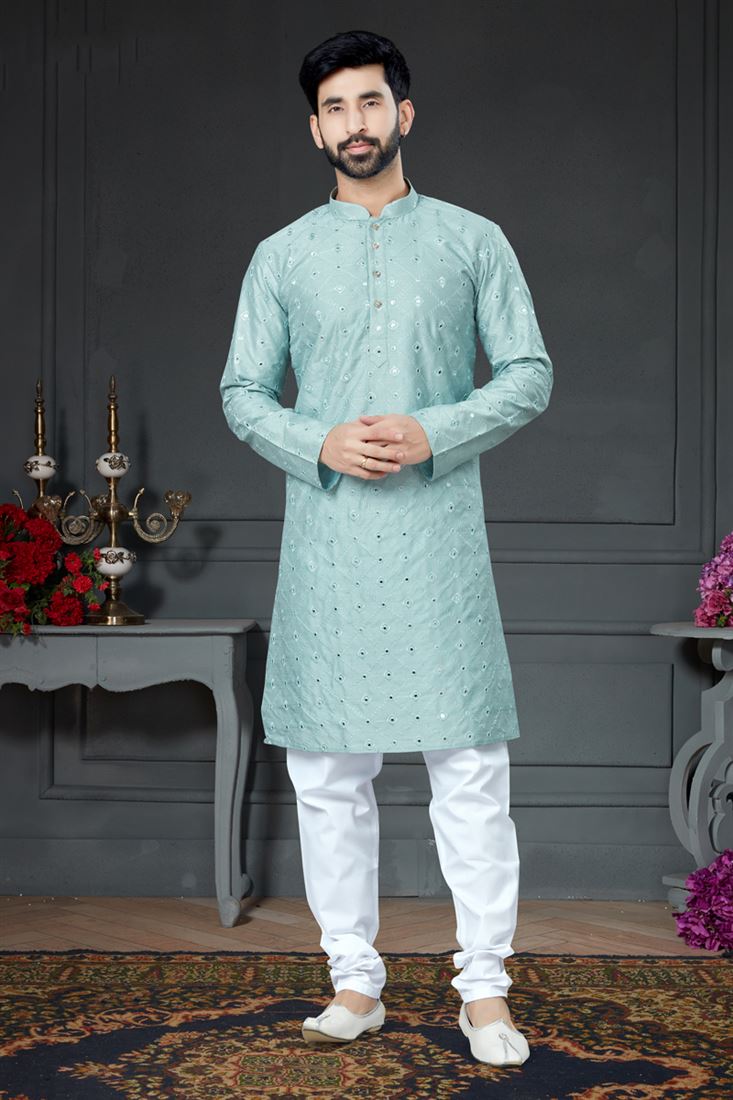 Cotton Silk Sky Blue Magnificent Readymade Men Kurta Pyjama For Sangeet Wear