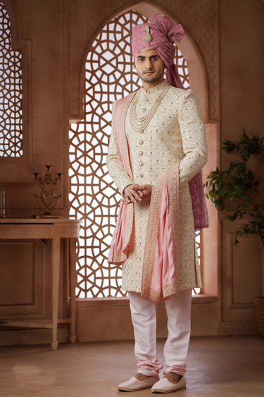 Cream Art Silk Fabric Graceful Readymade Men Groom Sherwani For Wedding Wear