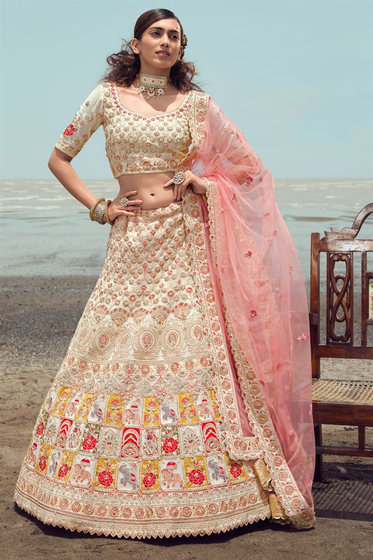 Cream Color Georgette Fabric Pleasing Embroidered Lehenga
