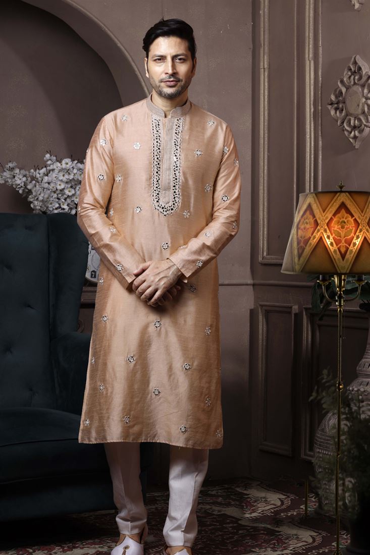 Cream Color Silk Fabric Wedding Wear Fancy Readymade Kurta Pyjama For Men