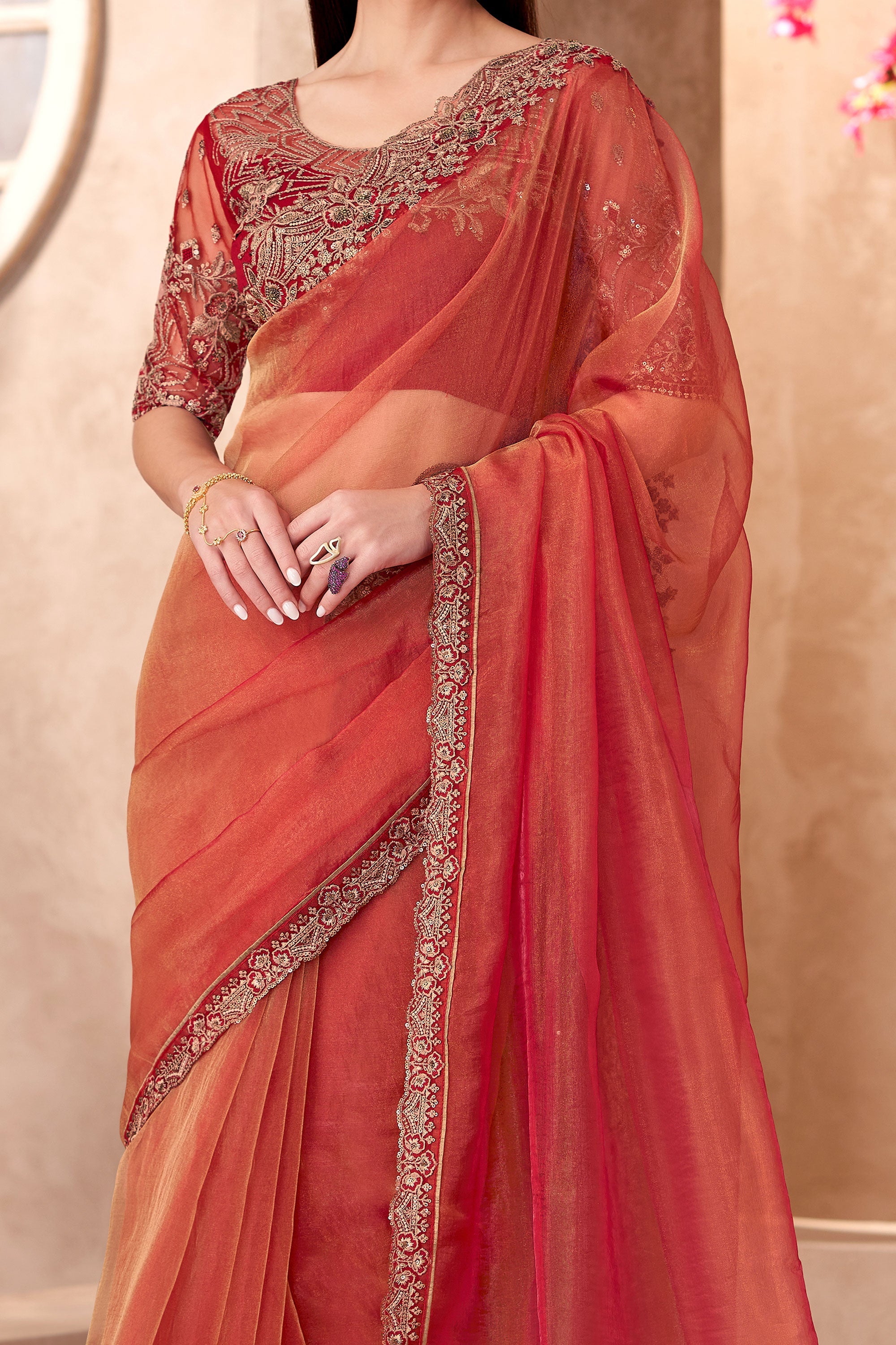 Creative Border Work On Saree In Rust Color Tissue Fabric