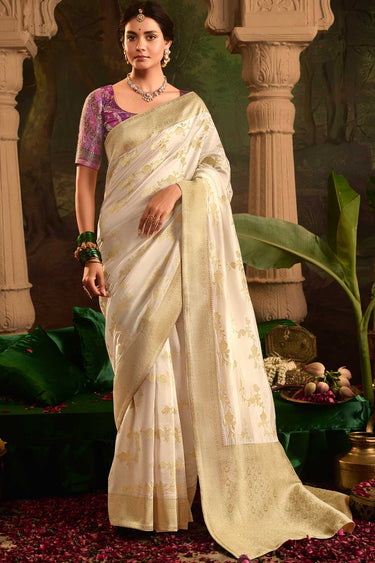 Crepe Silk Fabric Cream Color Excellent Saree With Weaving Work
