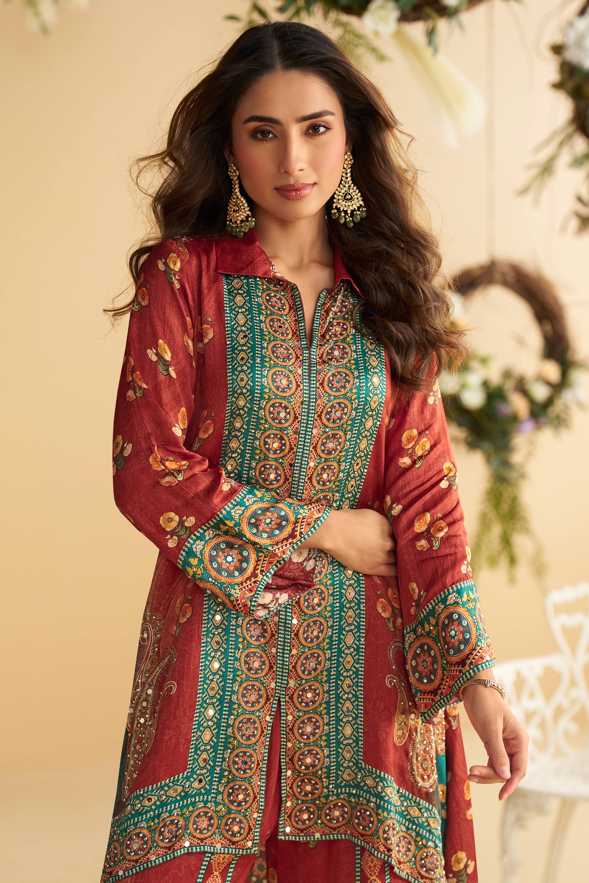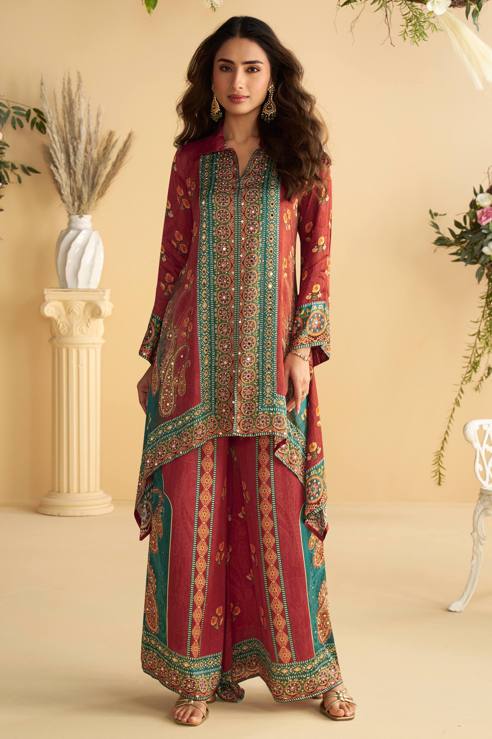 Crepe Silk Function Wear Maroon Printed Designer Co Ord Set