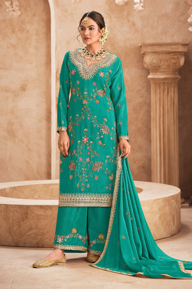 Cyan Color Embroidered Chinon Readymade Palazzo Dress