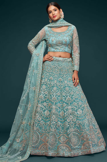 Cyan Color Embroidered Work On Net Fabric Beatific Lehenga