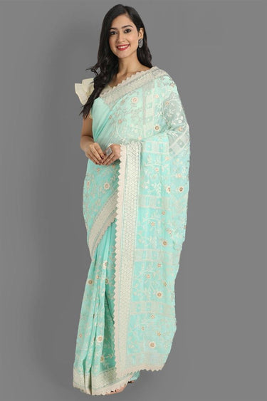 Cyan Color Festival Wear Georgette Fabric Beguiling Lakhnavi Saree With Embroidered Work