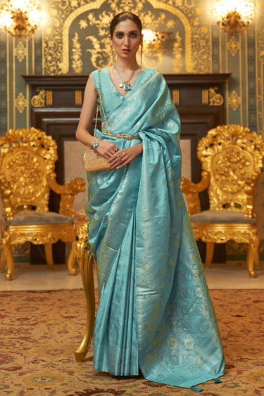 Cyan Weft Handloom Weaving Work Saree