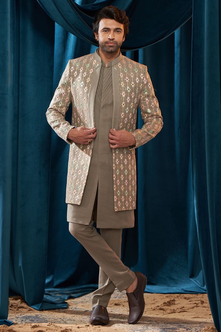 Dark Beige Color Wedding Wear Linen Fabric Designer Heavy Embroidered Readymade Indo Western For Men
