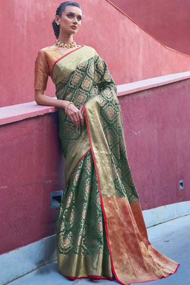 Dark Green Color Puja Wear Trendy Patola Art Silk Fabric Weaving Work Saree