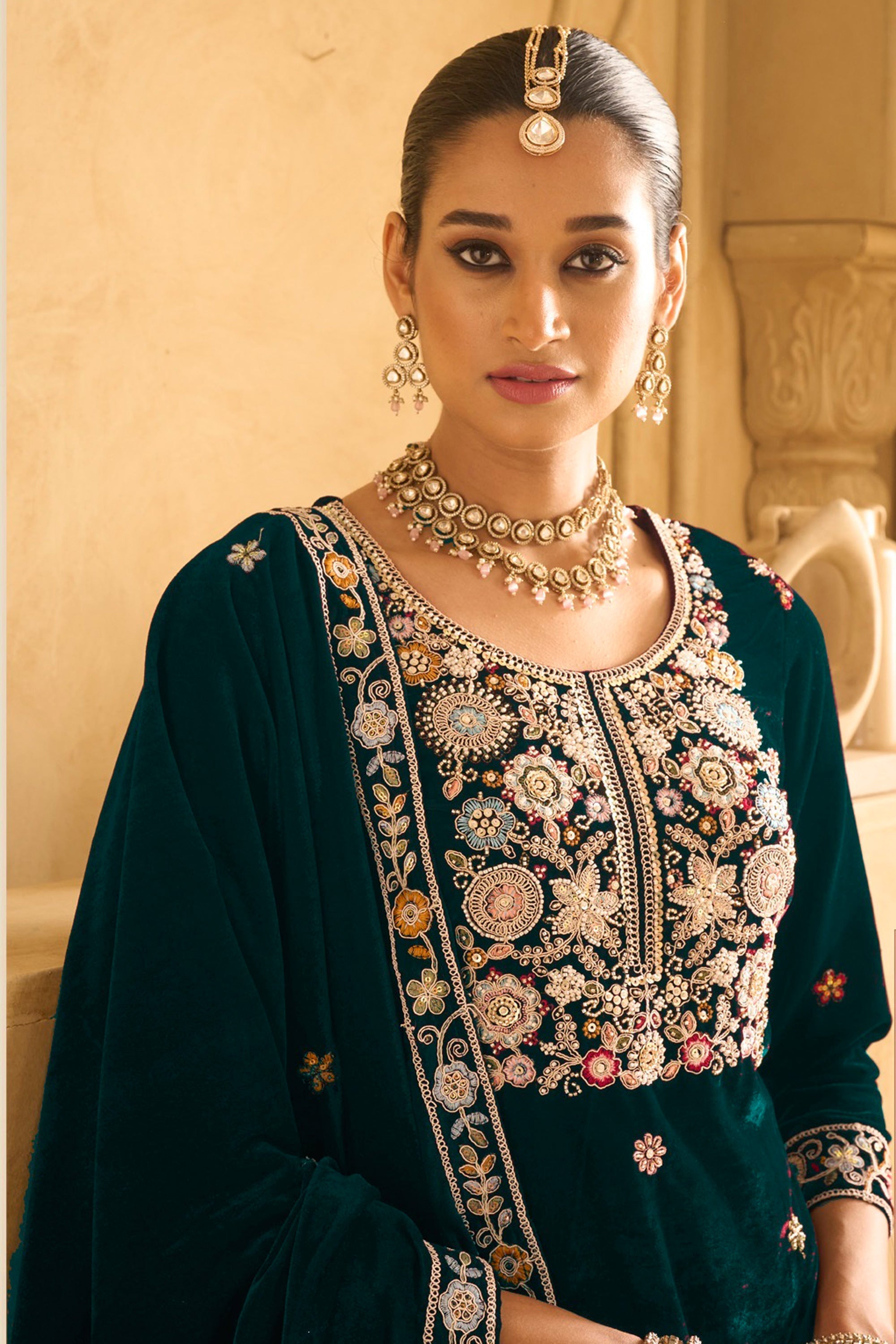 Dark Green Embroidered Velvet Palazzo Salwar Suit For Sangeet Wear