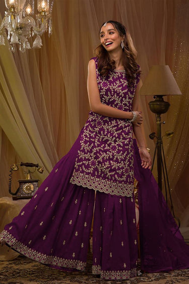 Dazzling Georgette Fabric Purple Color Function Wear Sharara Suit