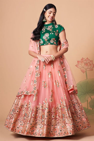 Dazzling Sangeet Wear Peach Color Lehenga Choli In Net Fabric