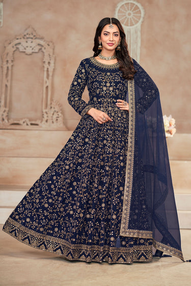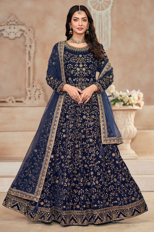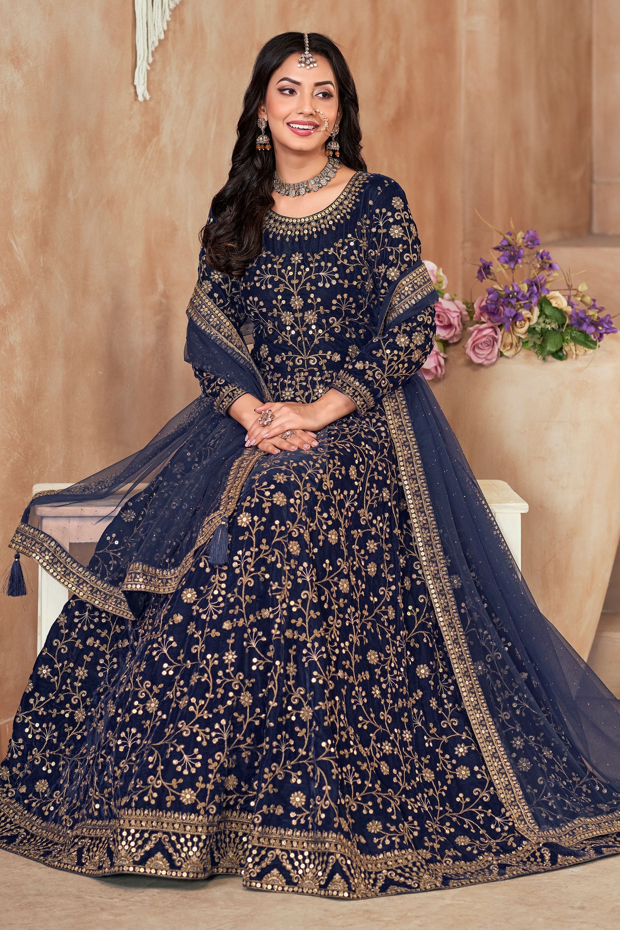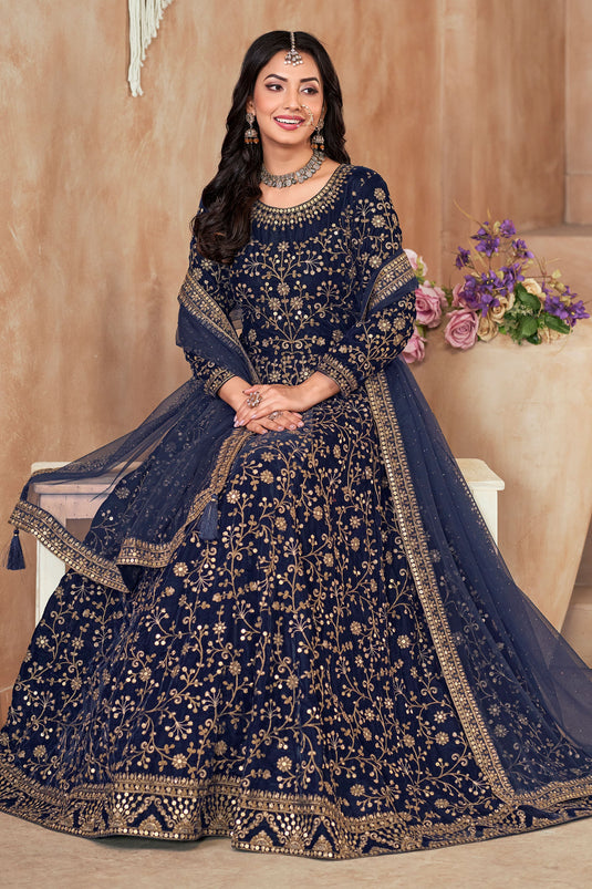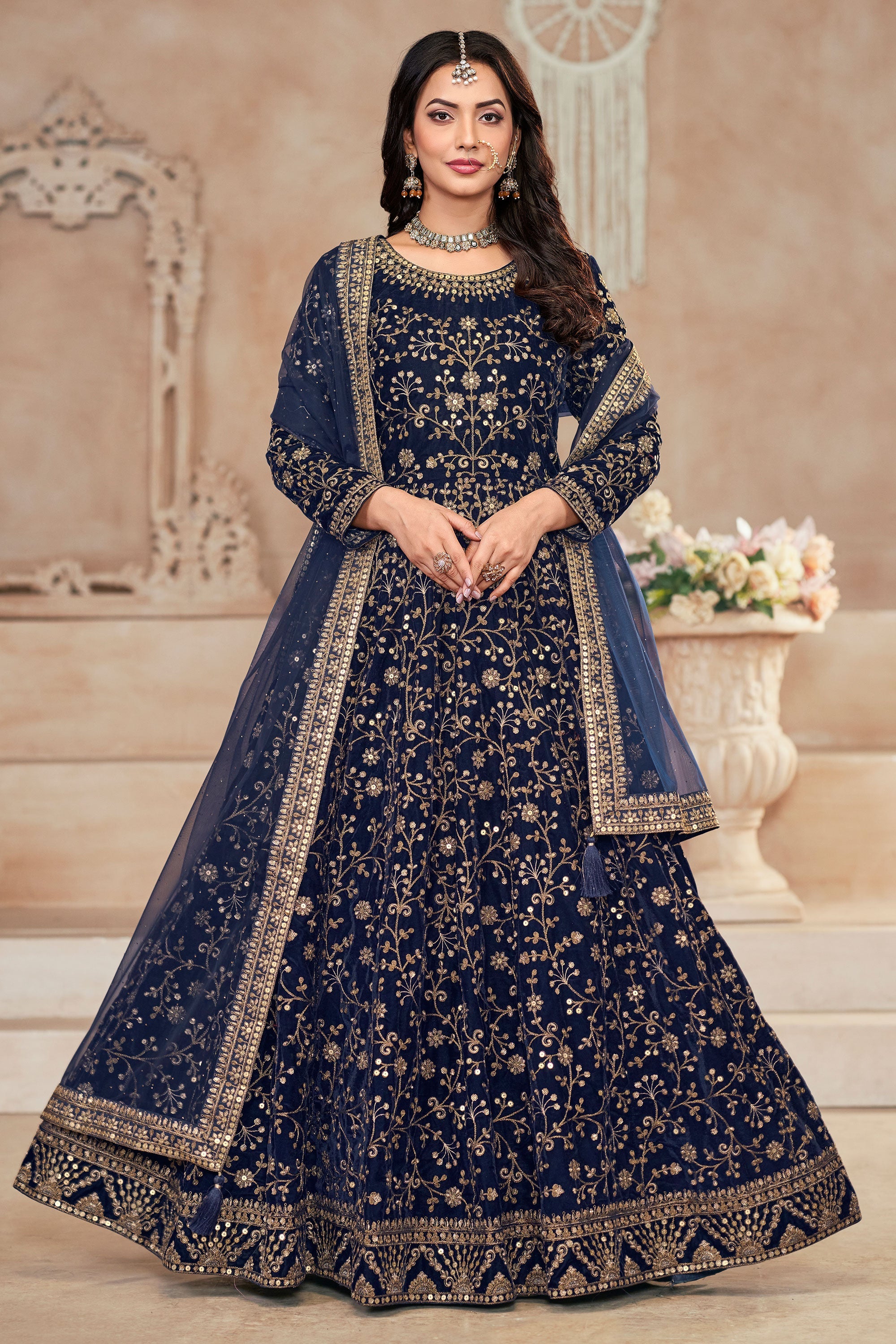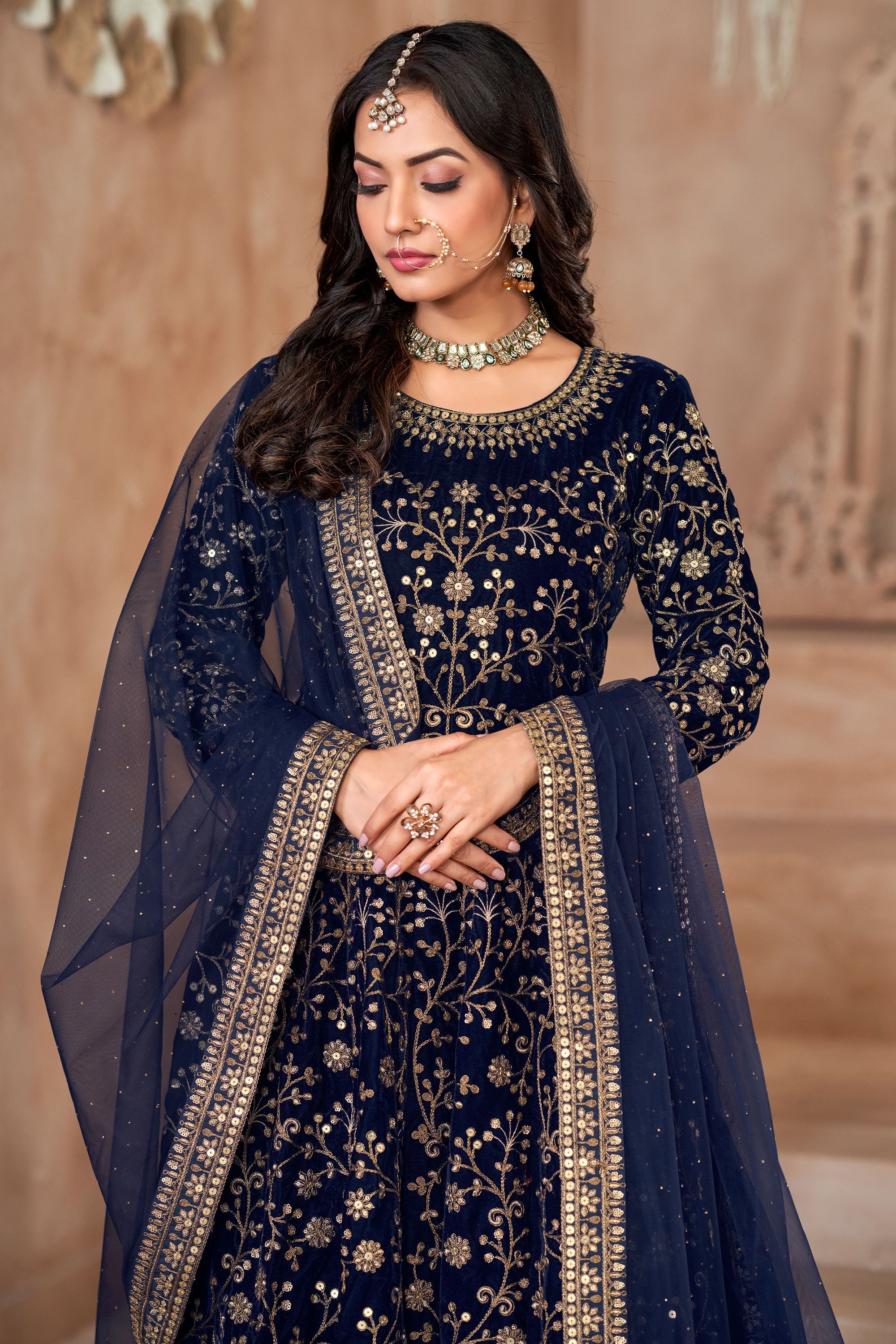 Dazzling Velvet Fabric Navy Blue Color Anarkali Salwar Kameez