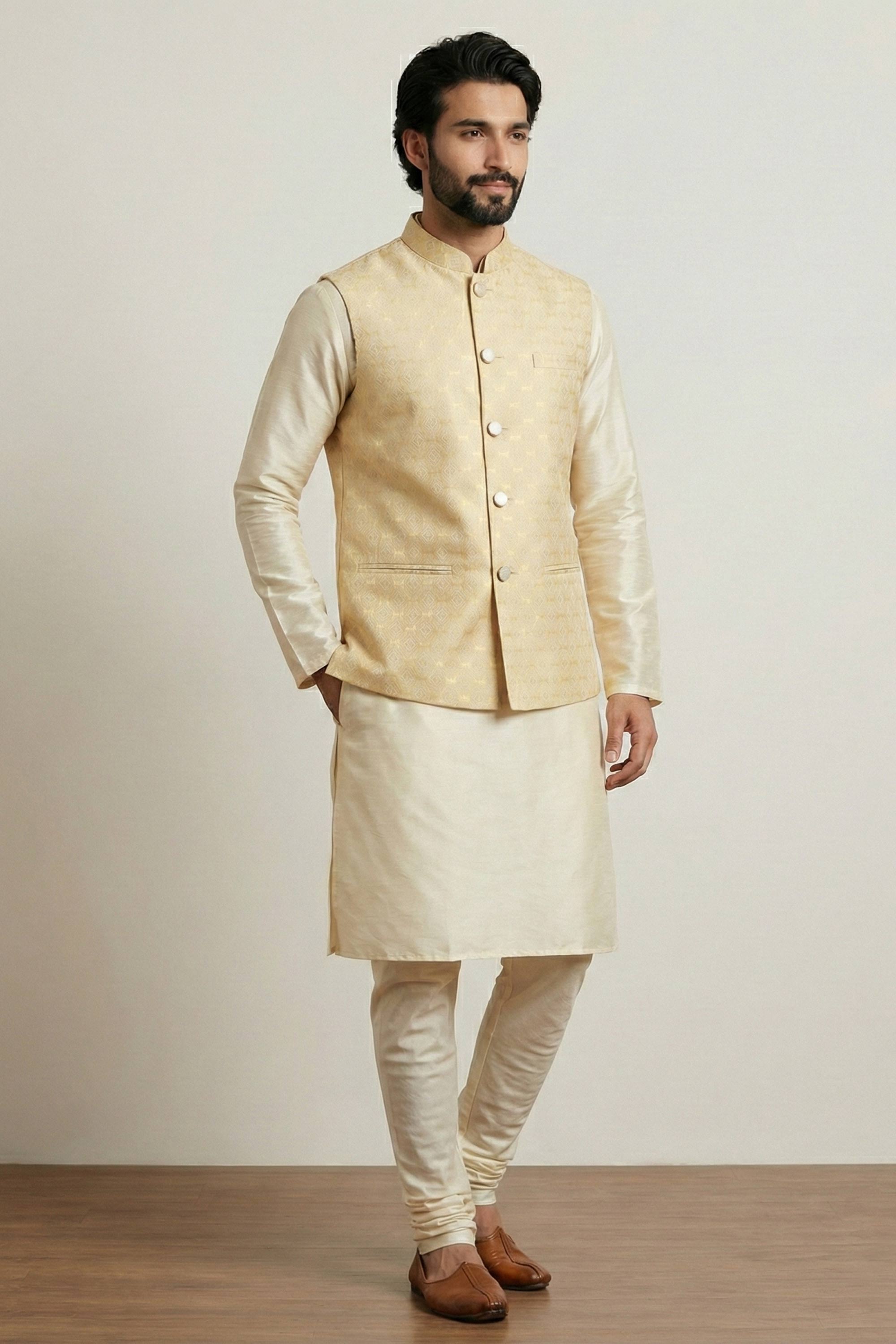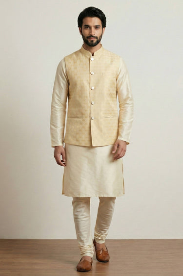 Dhupion Beige Color Men Readymade Kurta Pyjama With Designer Jacket For Function Wear