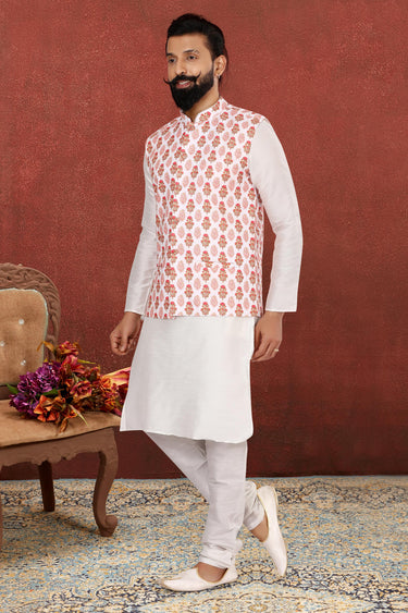 Dhupion Silk Beautiful White Color Wedding Wear Readymade Kurta Pyjama For Men With Jacket