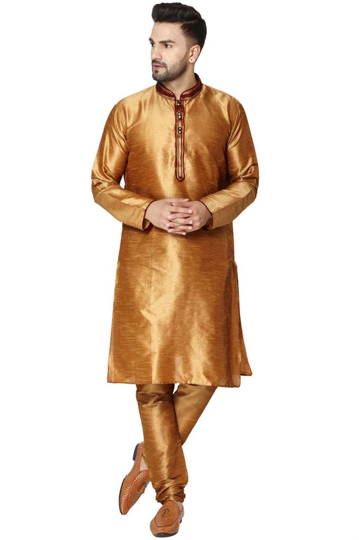 Dhupion Silk Fabric Festival Wear Graceful Kurta Pyjama In Dark Beige Color
