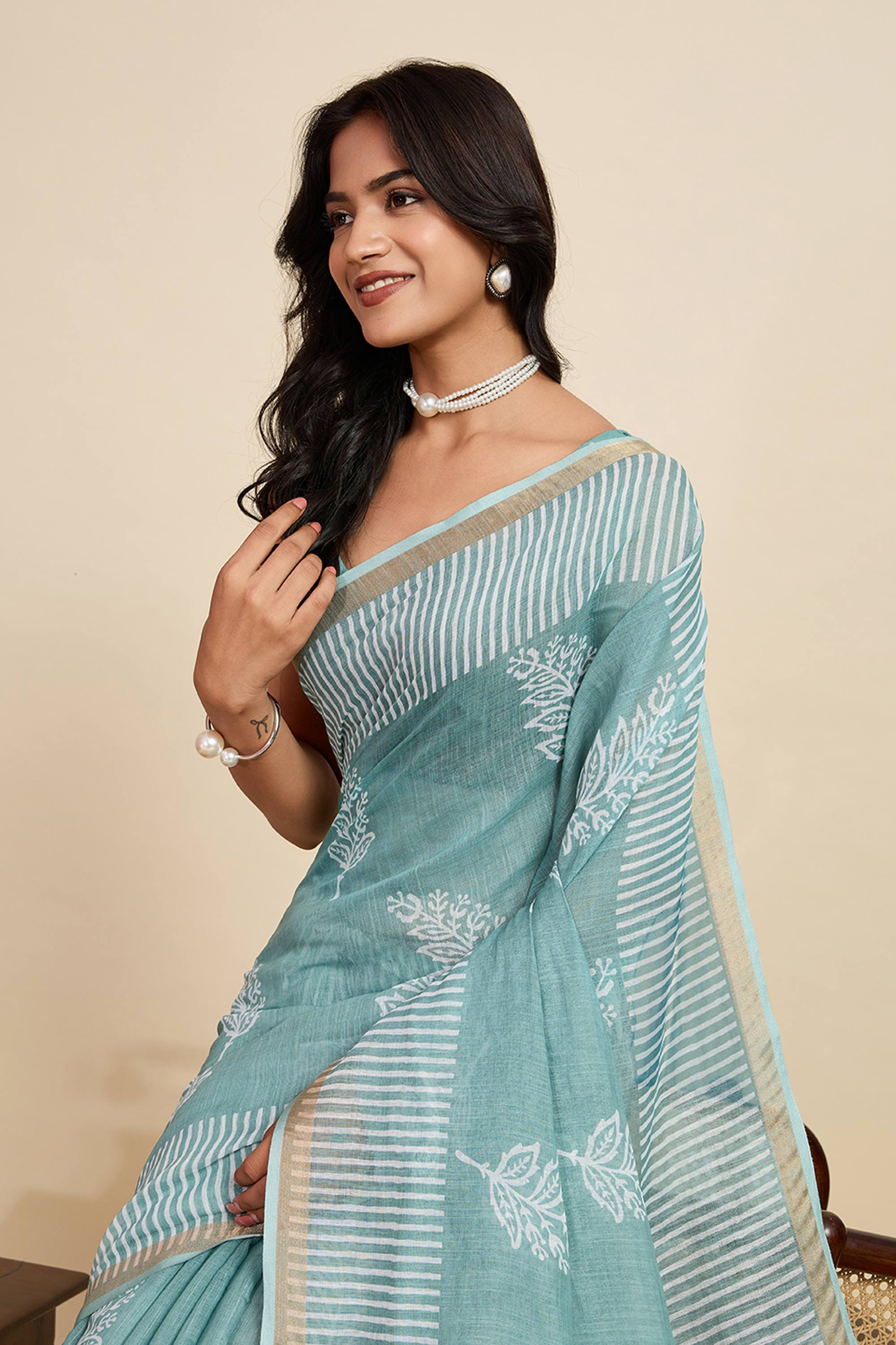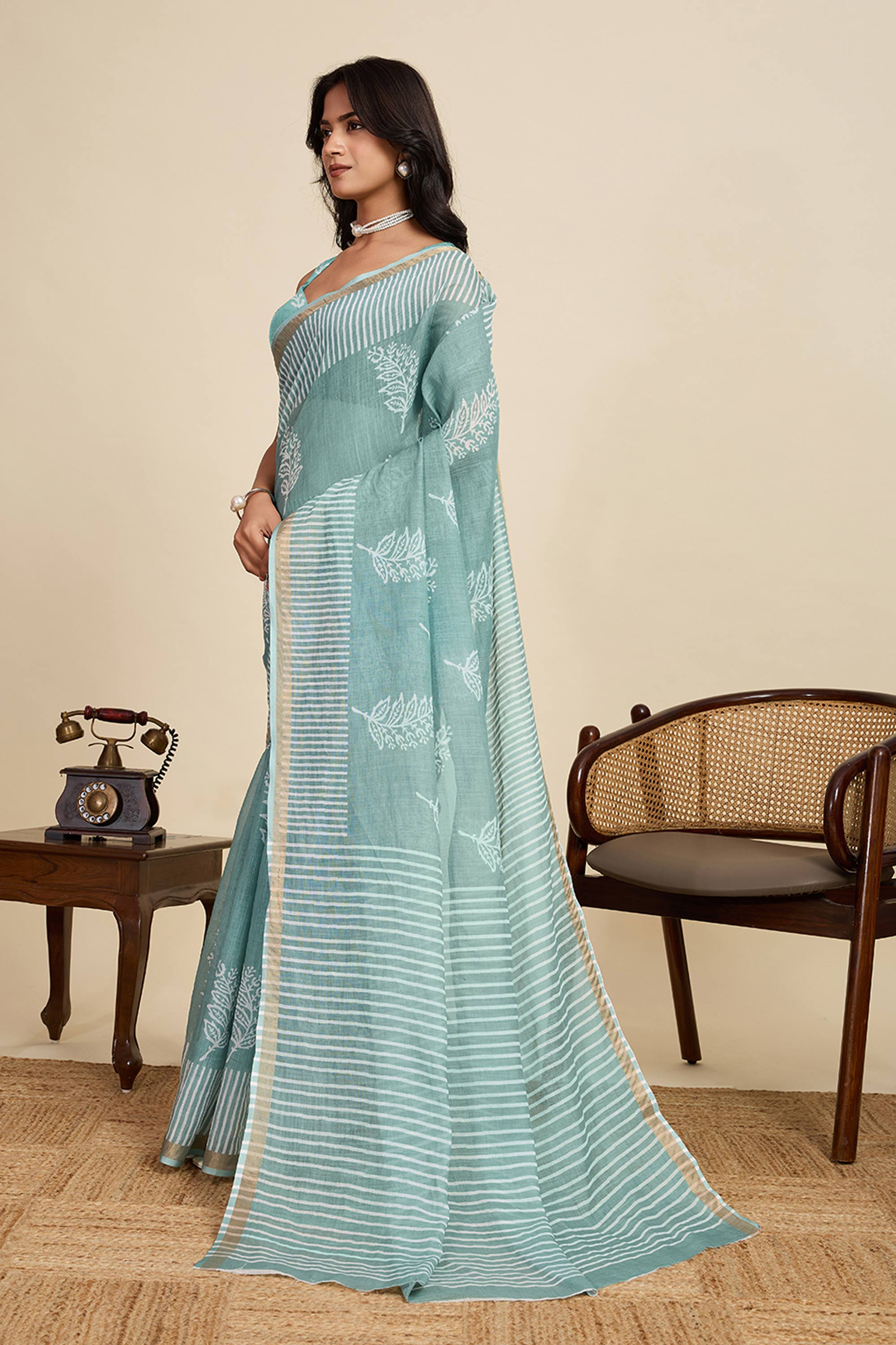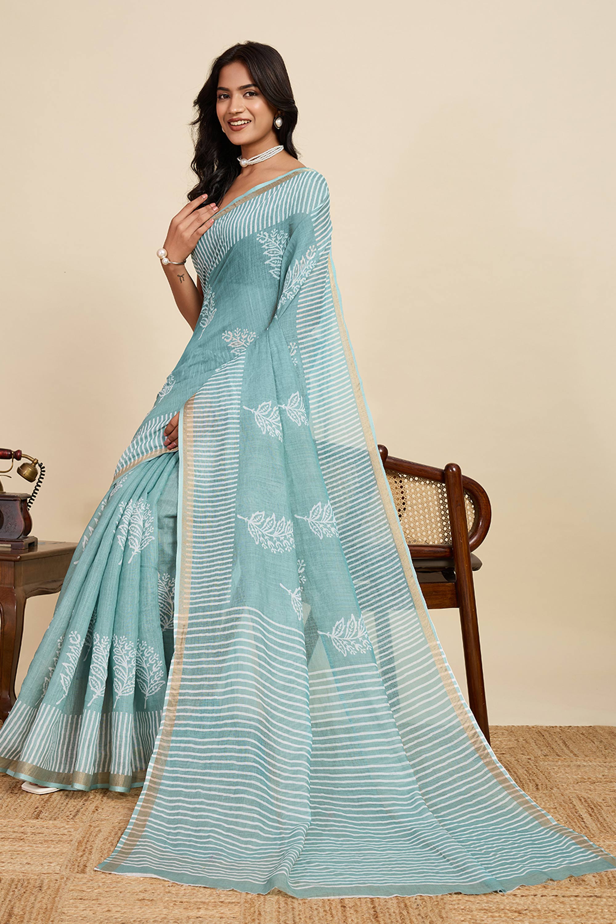 Digital Printed Light Cyan Linen Daily Wear Saree