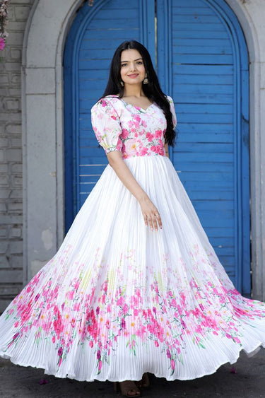 Digital Printed Work On Maslin Fabric Readymade Gown In White Color