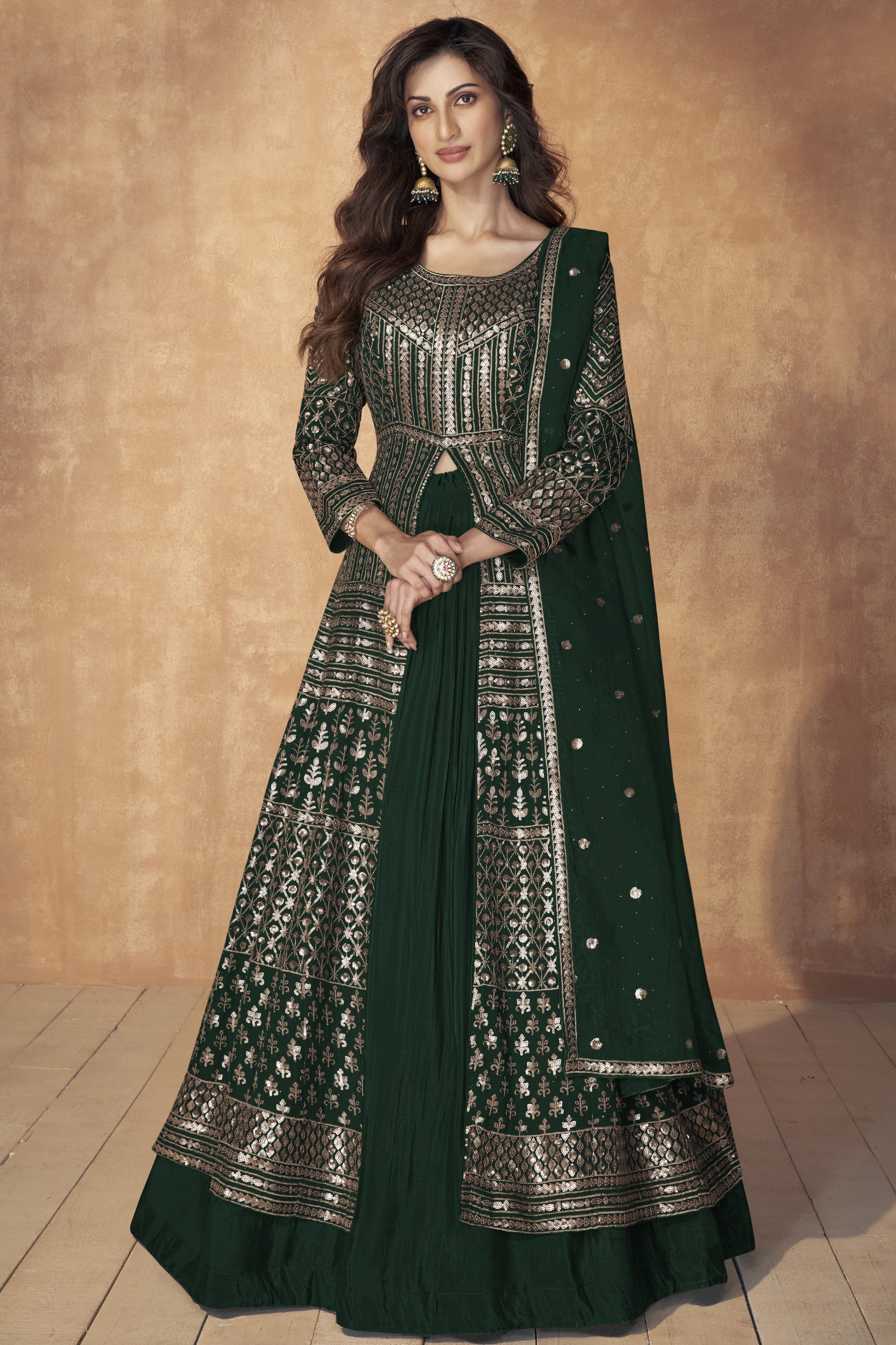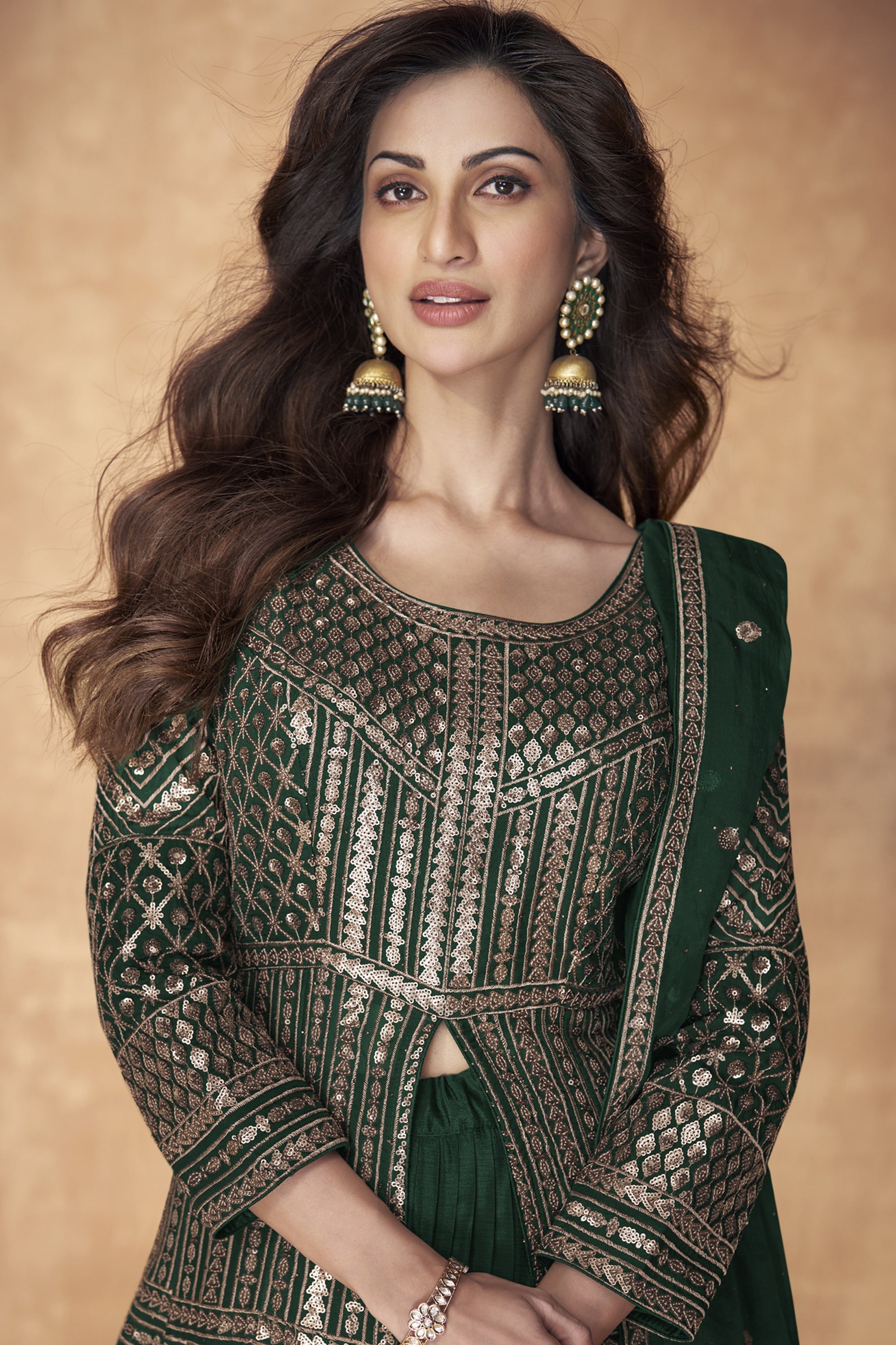 Diksha Singh Captivating Georgette Readymade Sharara Top Lehenga In Dark Green Color