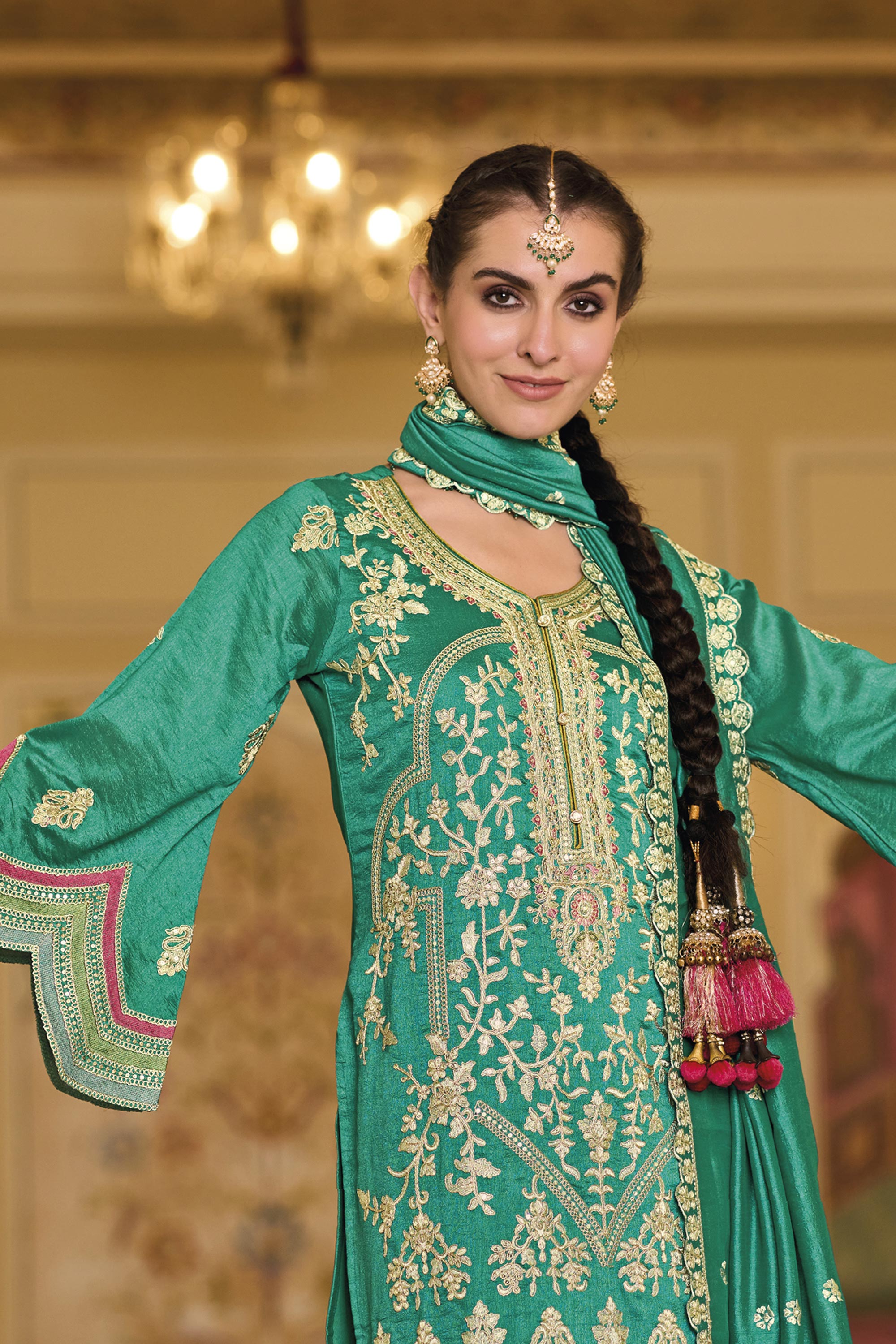 Diwali Special Art Silk Fabric Green Color Embroidered Readymade Designer Salwar Suit