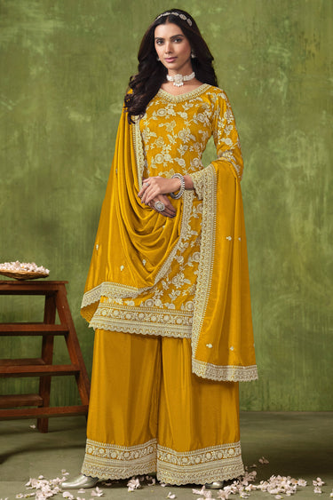 Dola Silk Fabric Mustard Color Jacquard Work Elegant Palazzo Suit