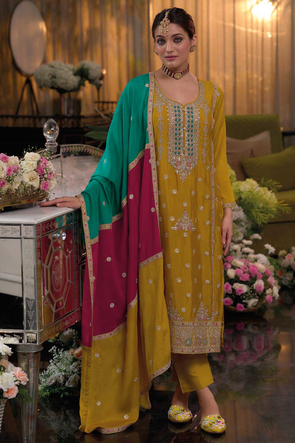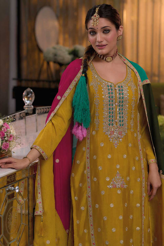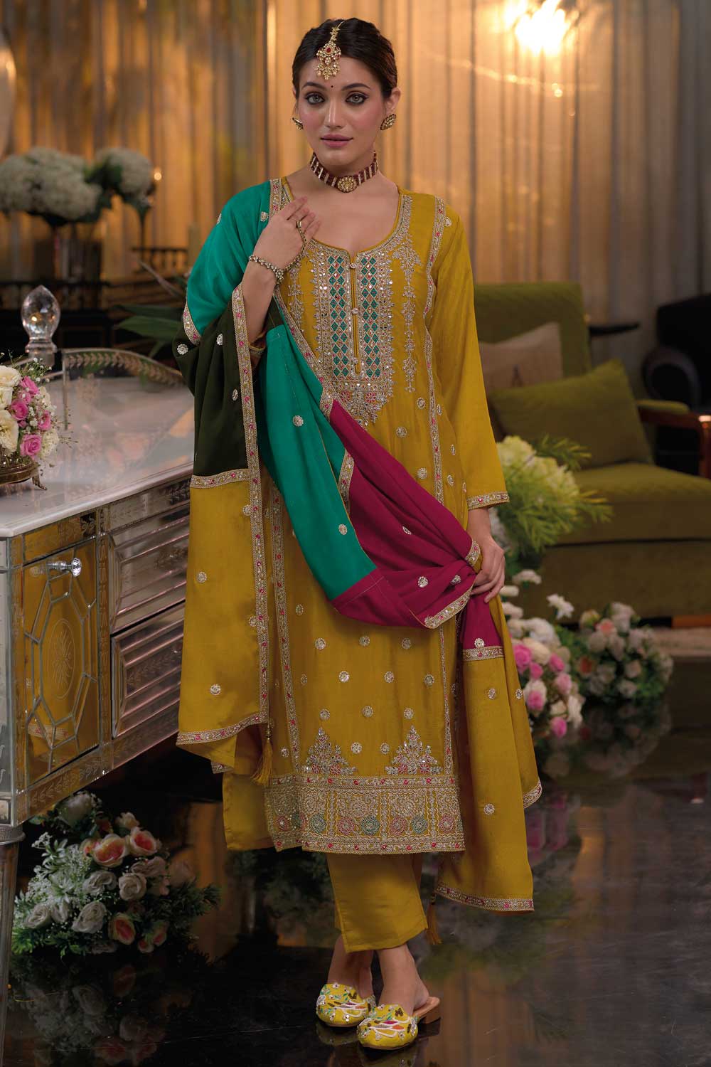 Elegant Chinon Fabric Mustard Readymade Salwar Suit