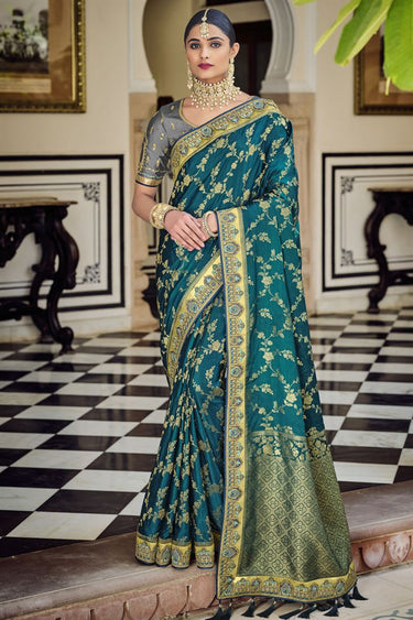 Elegant Wedding Wear Teal Color Banarasi Fabric Saree With Weaving Work