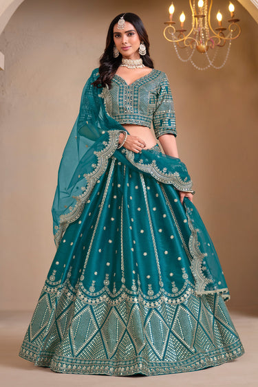 Embroidered Art Silk Fabric Teal Color Lehenga Choli