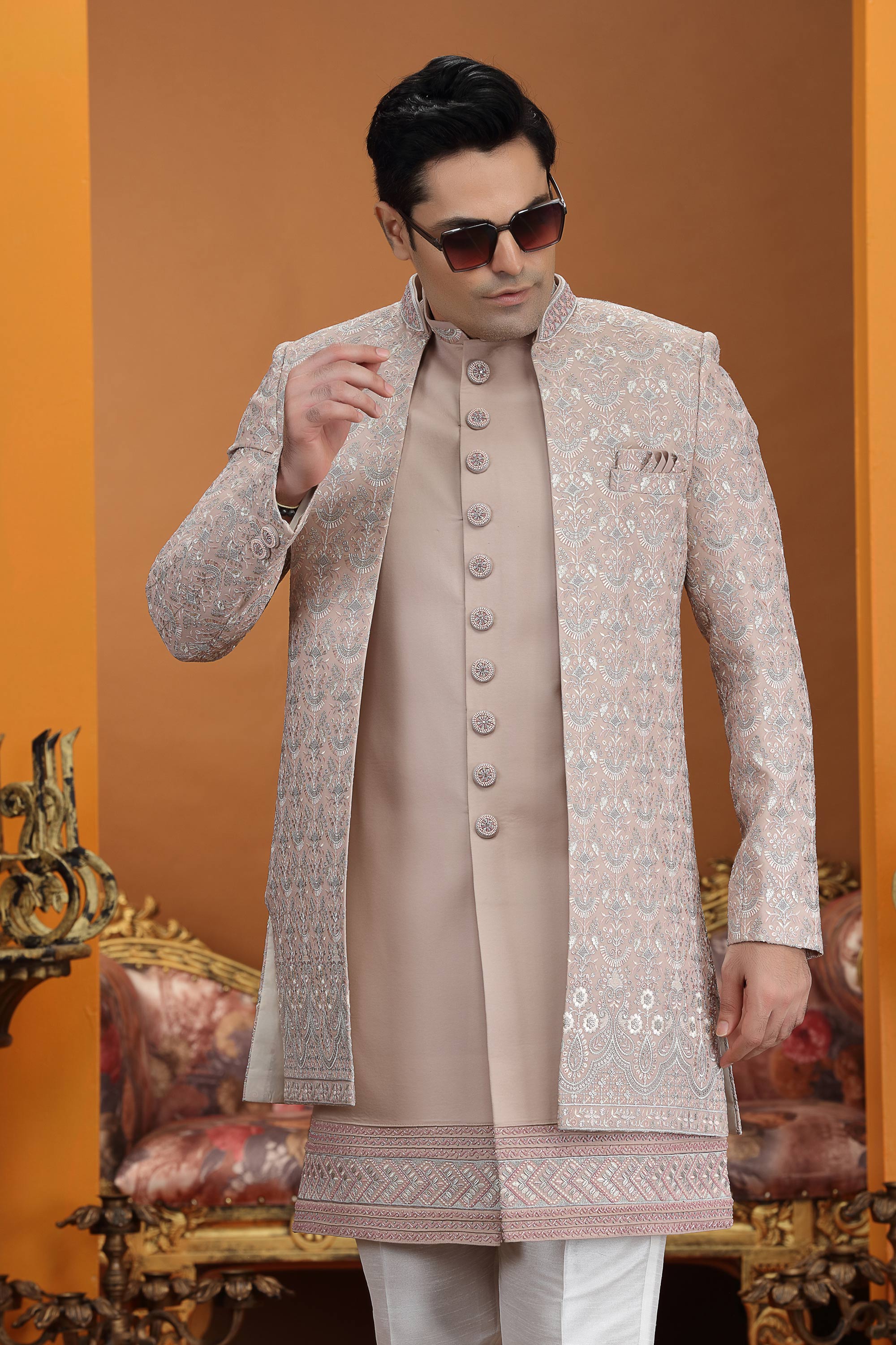 Embroidered Art Silk Peach Readymade Indo Western For Wedding Wear