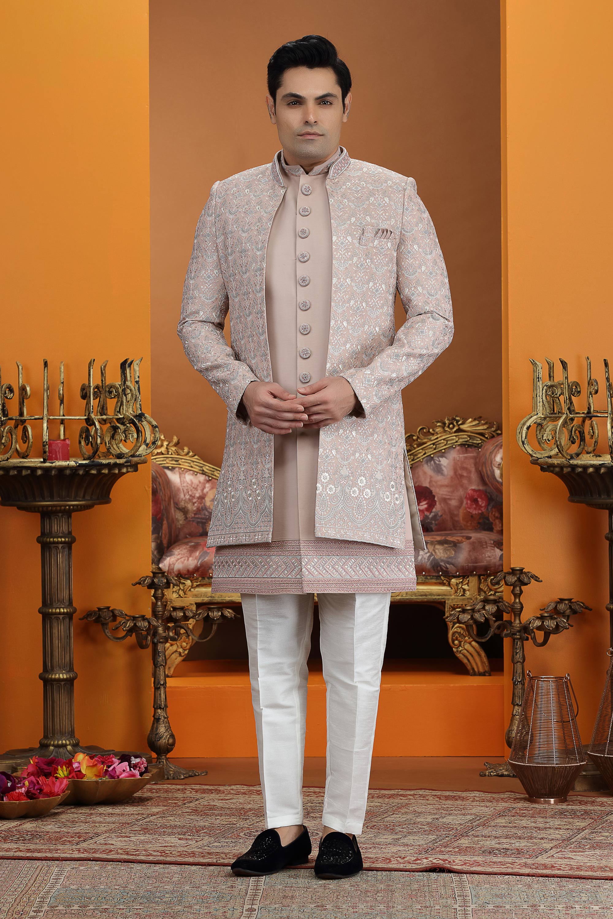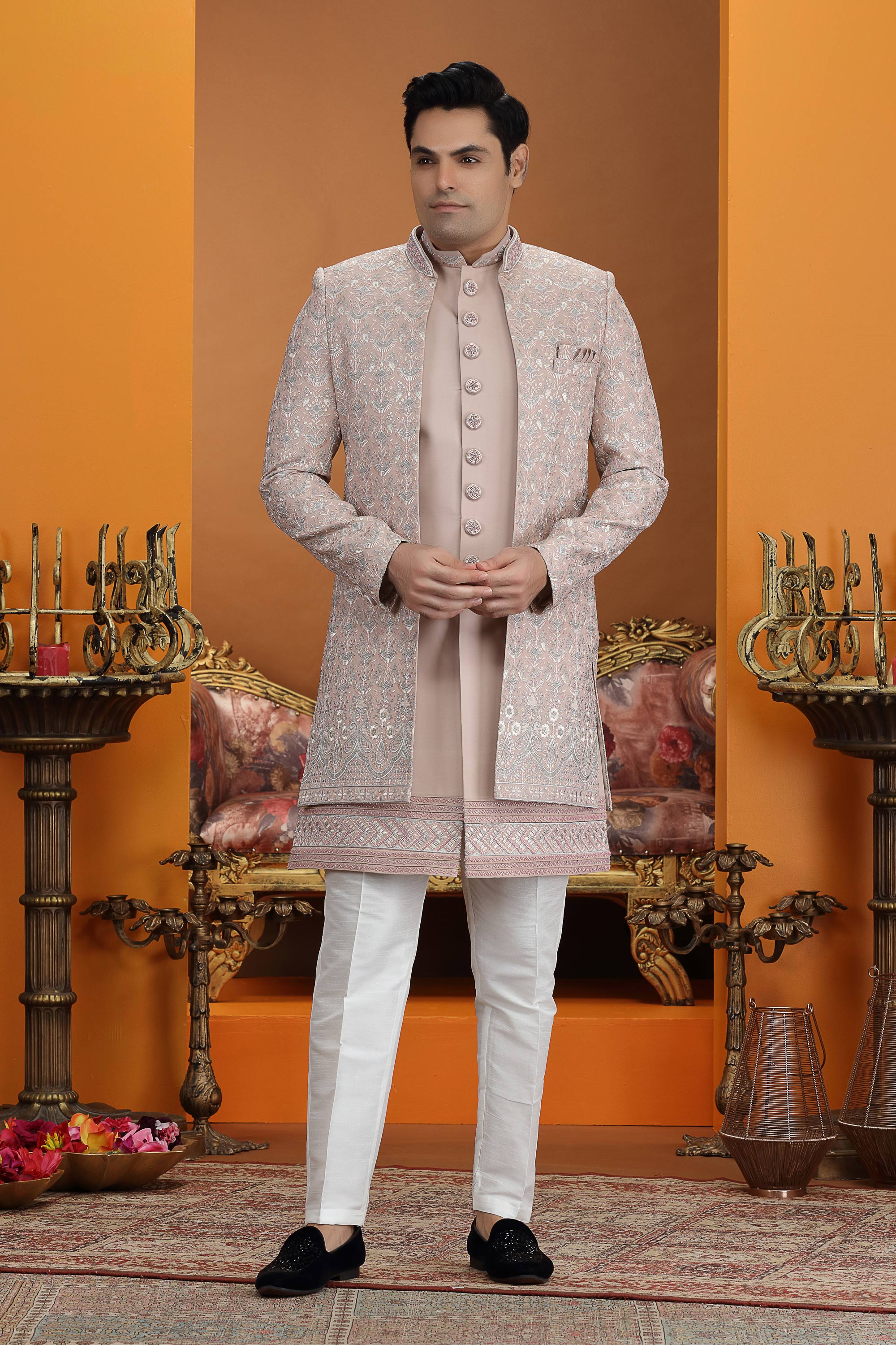 The outfit is paired with Dupion art silk Aligadhi pants, offering a traditional yet comfortable fit. A smooth faux satin lining ensures ease of wear during long wedding functions. Intricate embroidery on the jacket adds a touch of grandeur to the overall design. Due to digital photography, slight color variations may occur.