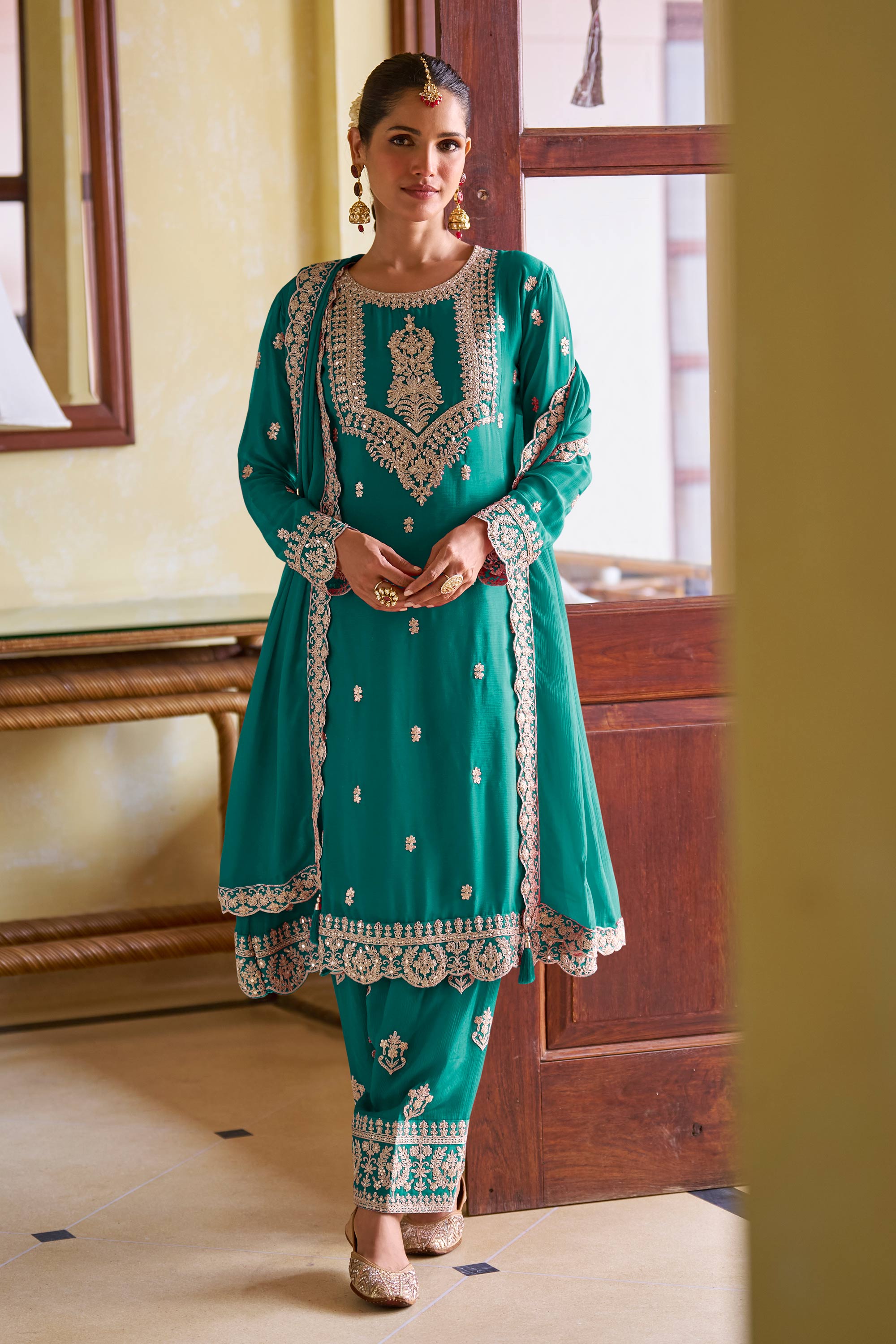 Embroidered Chinon Cyan Party Wear Readymade Designer Salwar Kameez With Dupatta