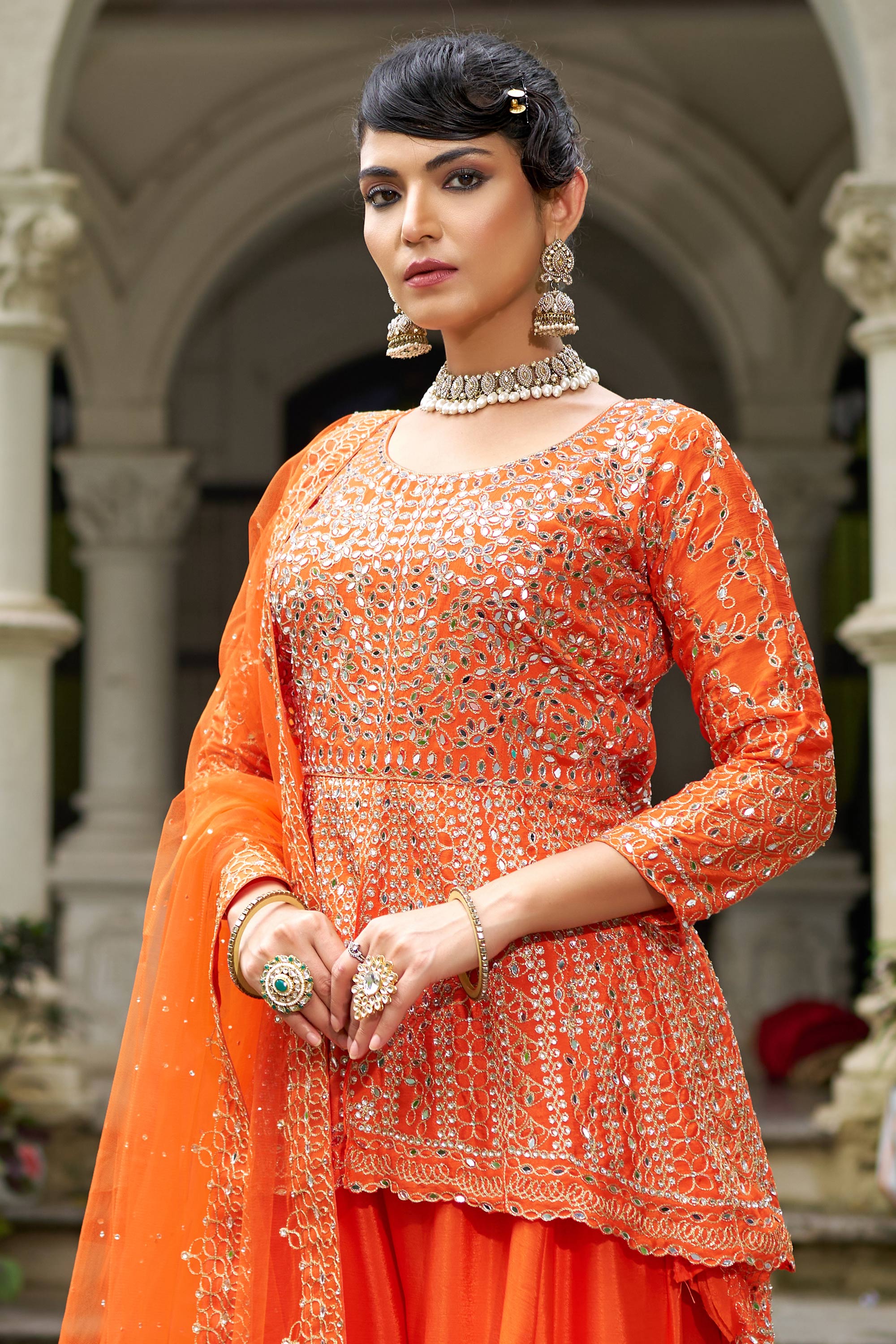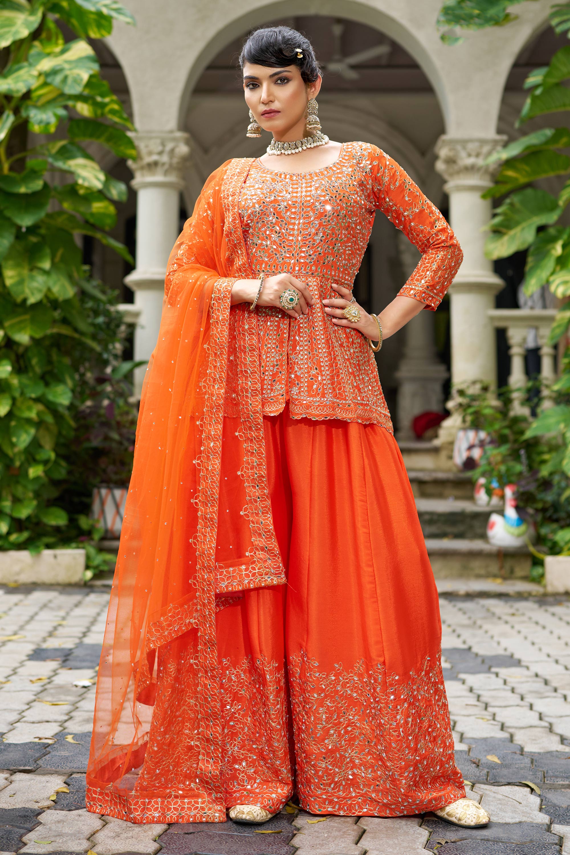 Embroidered Chinon Orange Wedding Wear Readymade Palazzo Suit With Dupatta