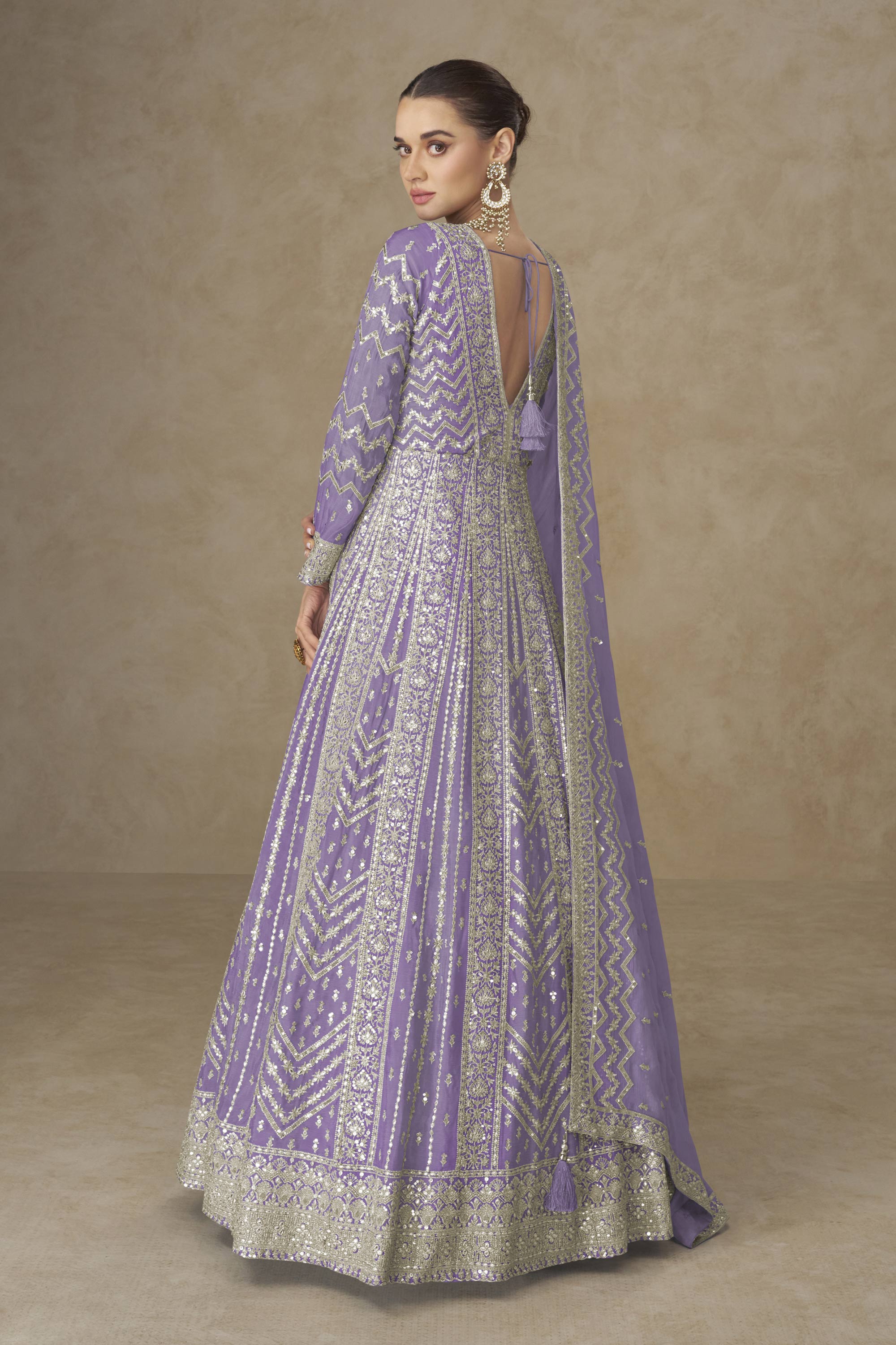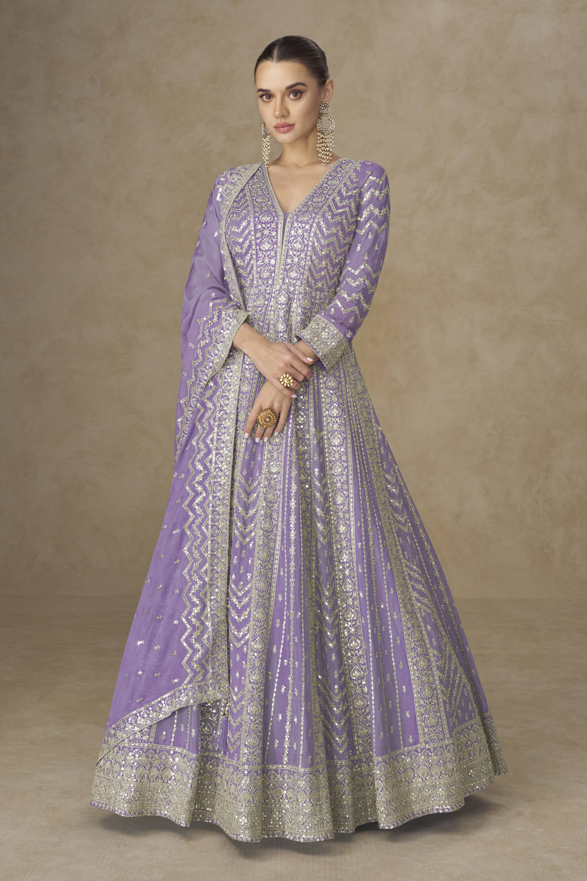 Embroidered Chinon Silk Lavender Designer Readymade Gown With Dupatta