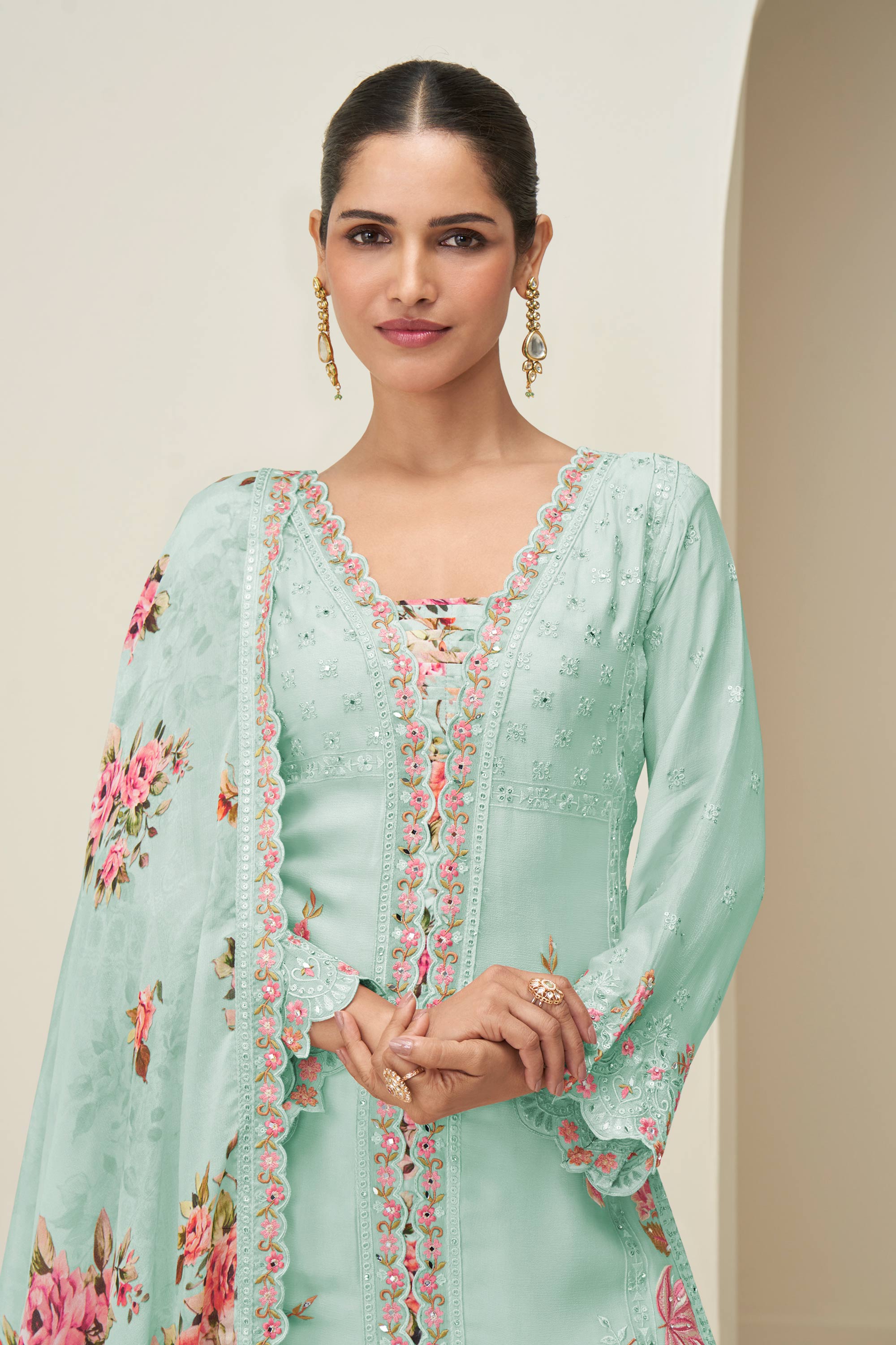 Embroidered Chinon Silk Light Cyan Sangeet Wear Readymade Palazzo Suit With Dupatta