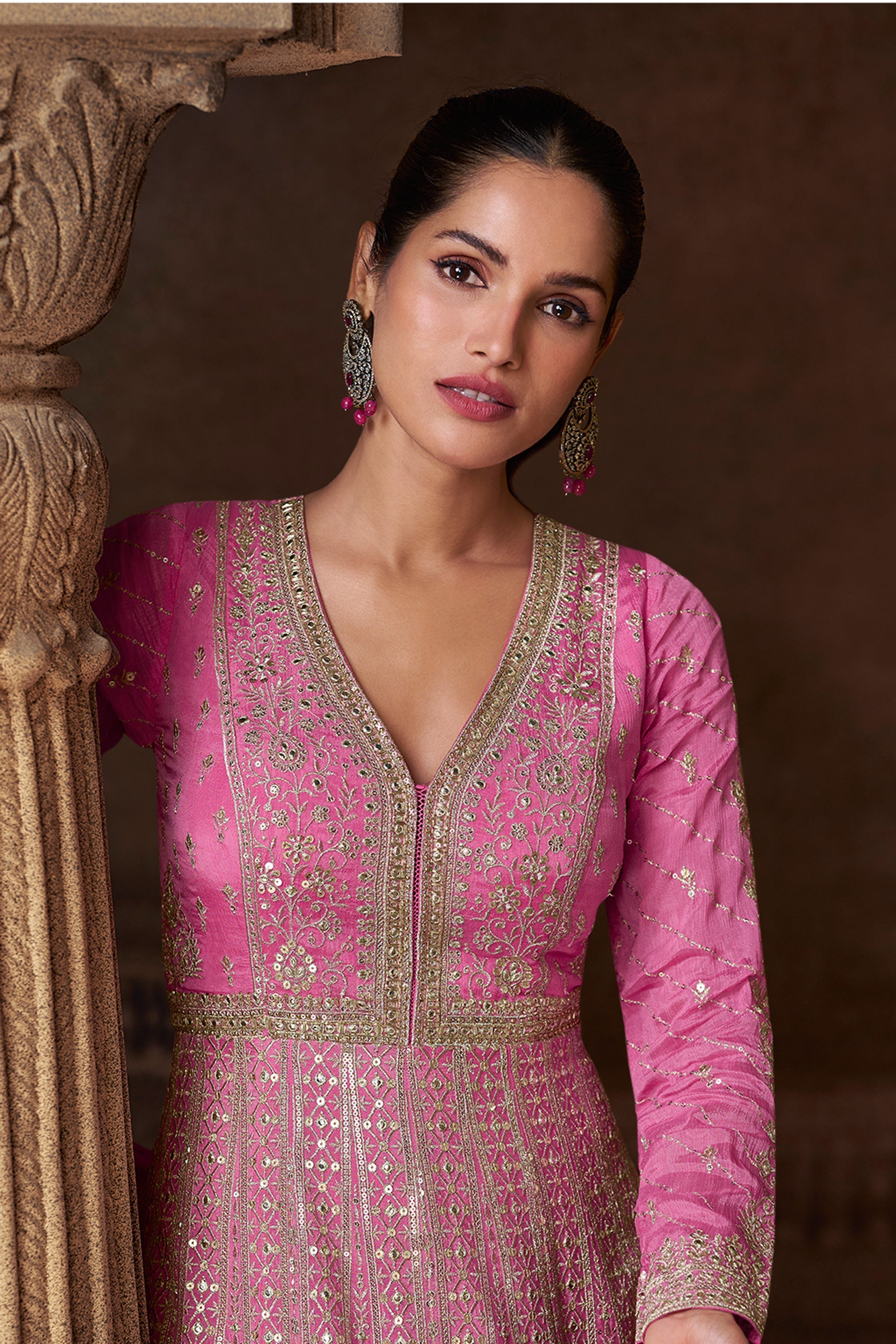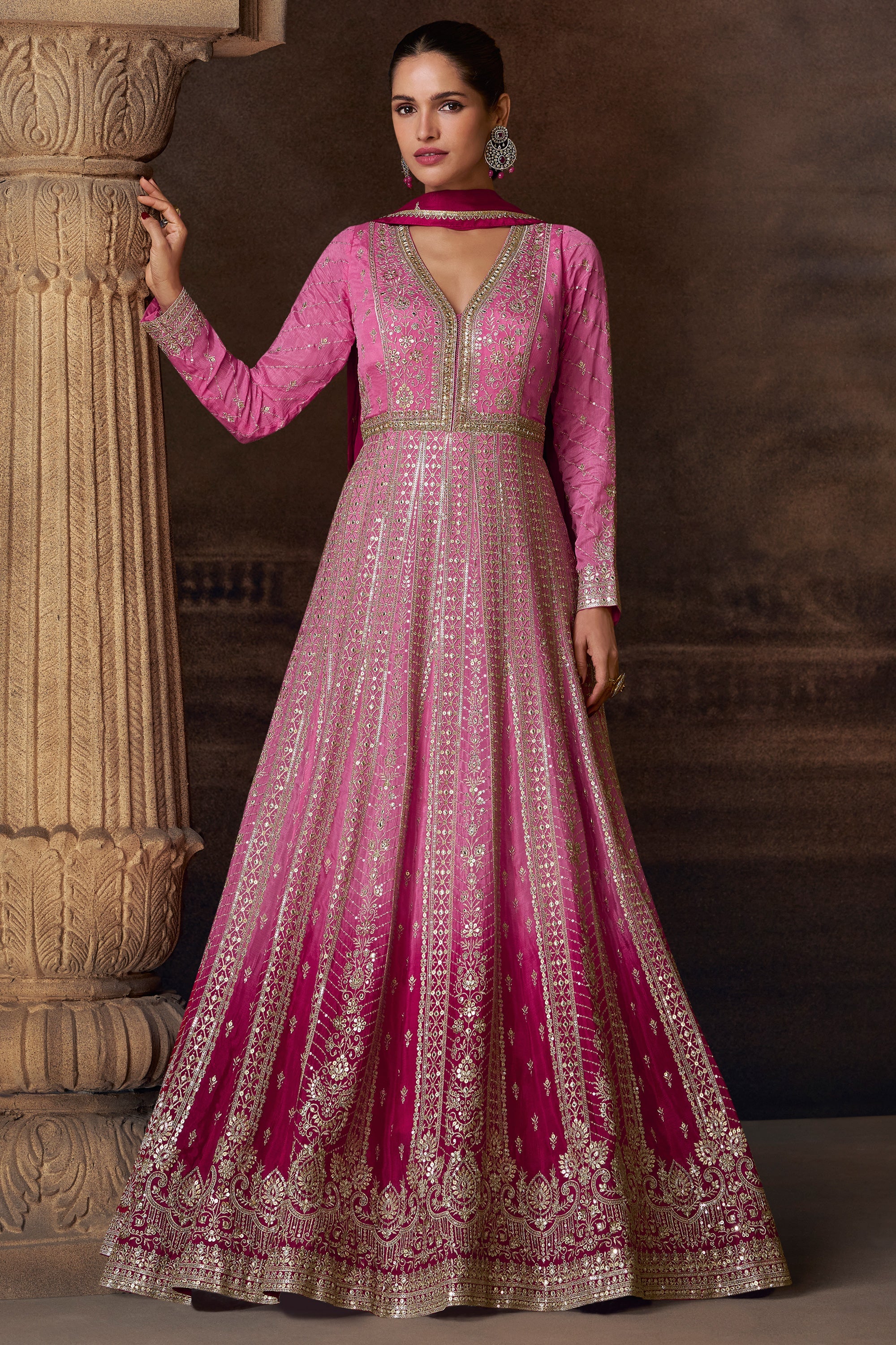 Embroidered Chinon Silk Pink Readymade Long Anarkali Style Gown With Dupatta