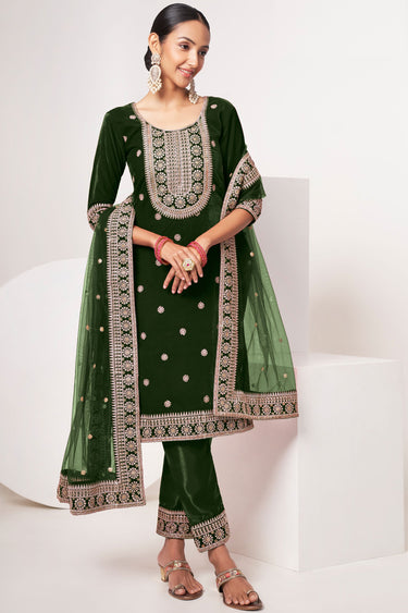 Embroidered Dark Green Color Salwar Kameez In Velvet Fabric