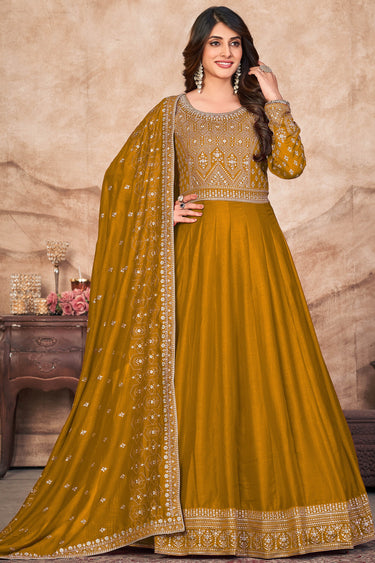 Embroidered Function Wear Anarkali Salwar Kameez In Art Silk Fabric Mustard Color