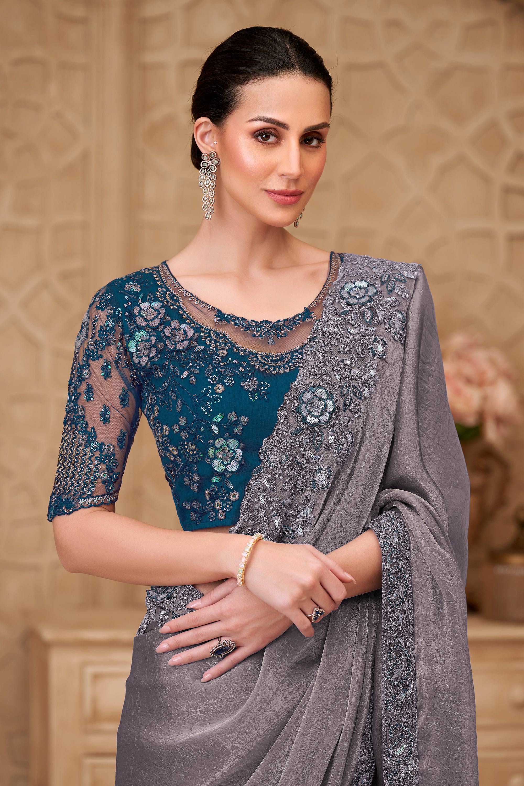 Embroidered Georgette Satin Grey Saree For Festive Wear
