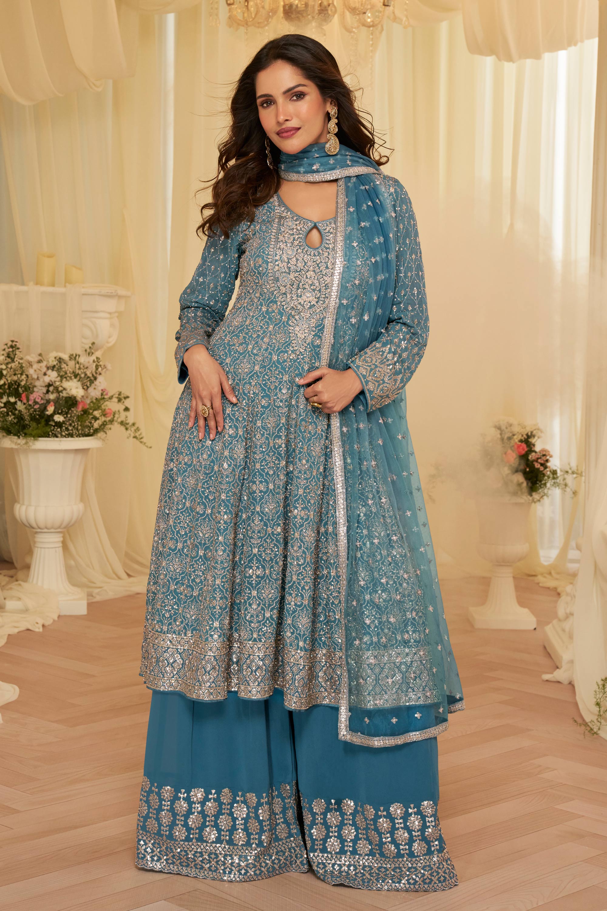 Embroidered Georgette Teal Sangeet Wear Readymade Palazzo Suit With Dupatta
