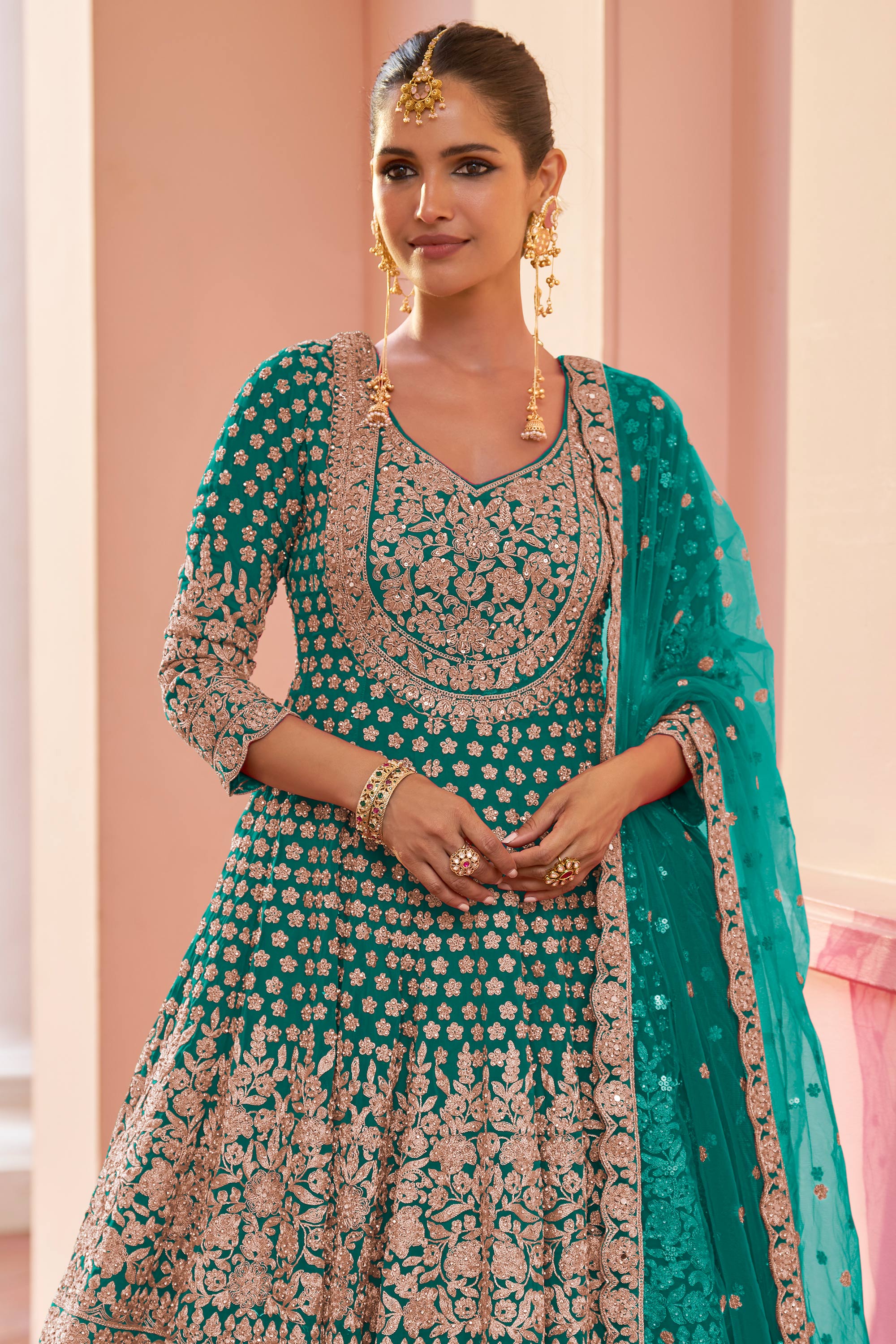 Embroidered Georgette Teal Wedding Wear Readymade Sharara Top Lehenga