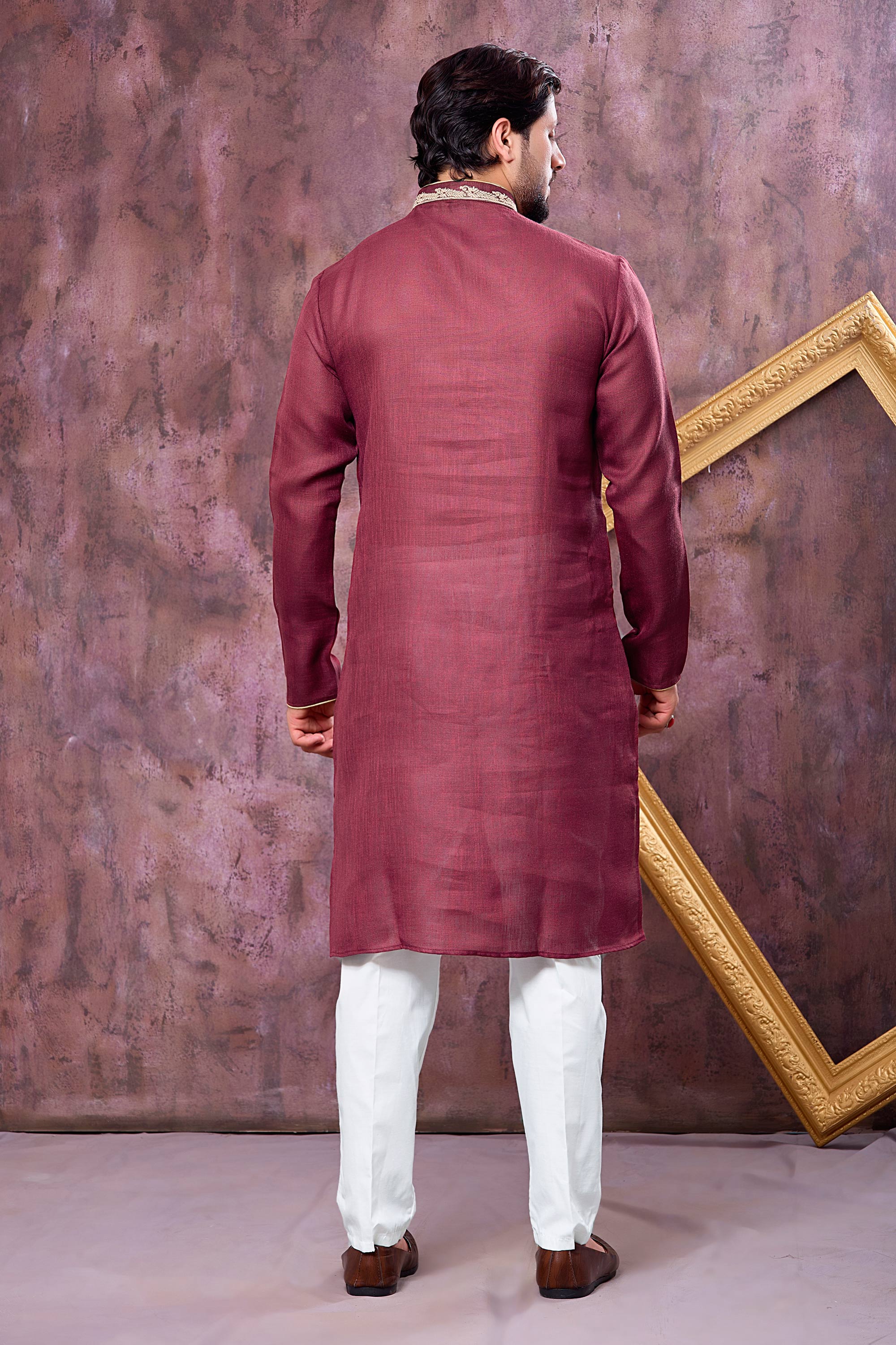 Designed for modern celebrations, this Mens Readymade Kurta set combines comfort and tradition effortlessly. The straight kurta is made from breathable cotton fabric and detailed with intricate embroidery work that adds sophistication to its design. Complementing the kurta is an Aligadhi pant crafted from premium art silk fabric that gives a rich and festive appearance. The elegant rich color makes this outfit ideal for sangeet and special occasions where you want to look your best. Kindly note that slight color differences may occur due to digital photography.