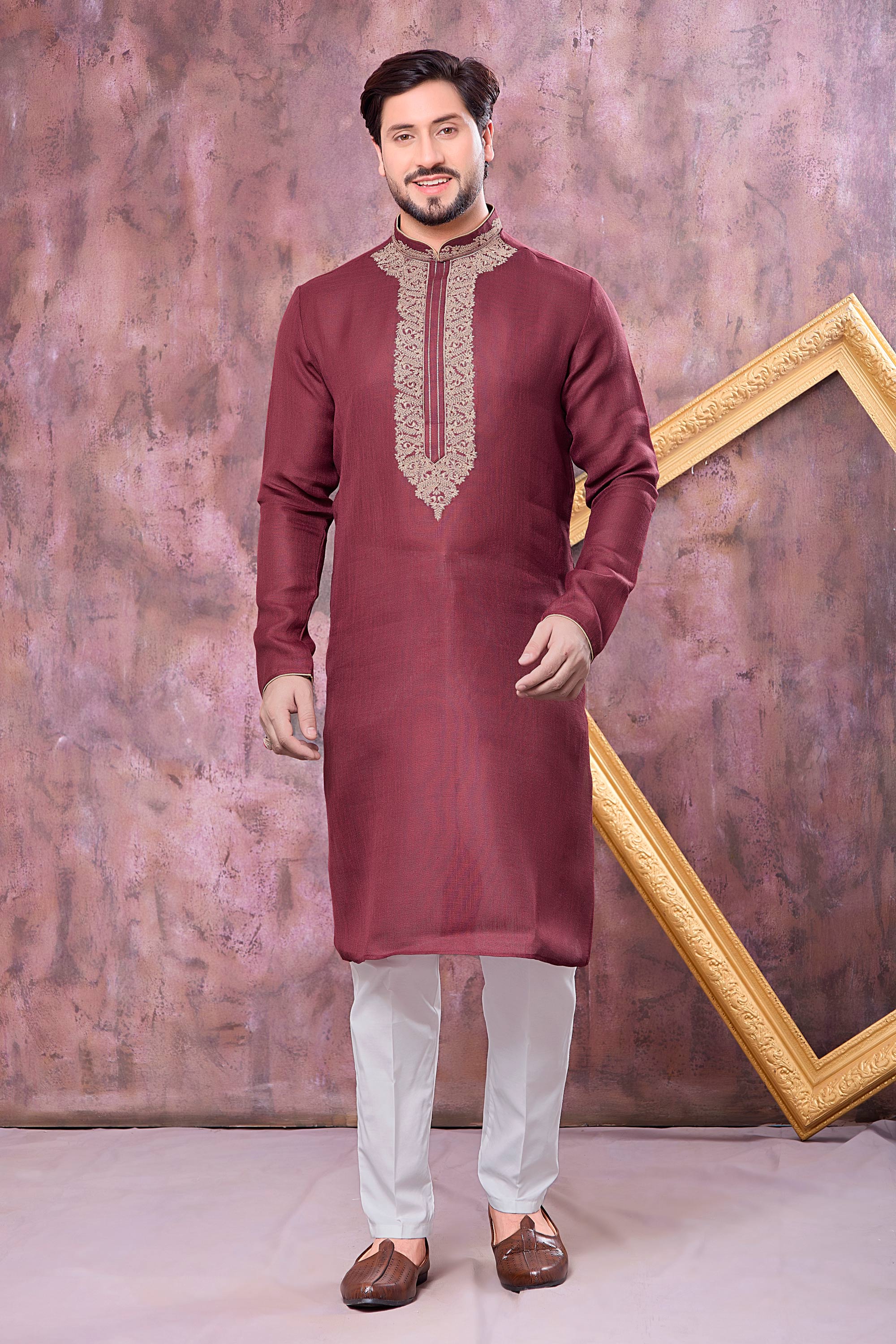 Embroidered Maroon Sangeet Wear Readymade Kurta With Aligadhi Pant For Men